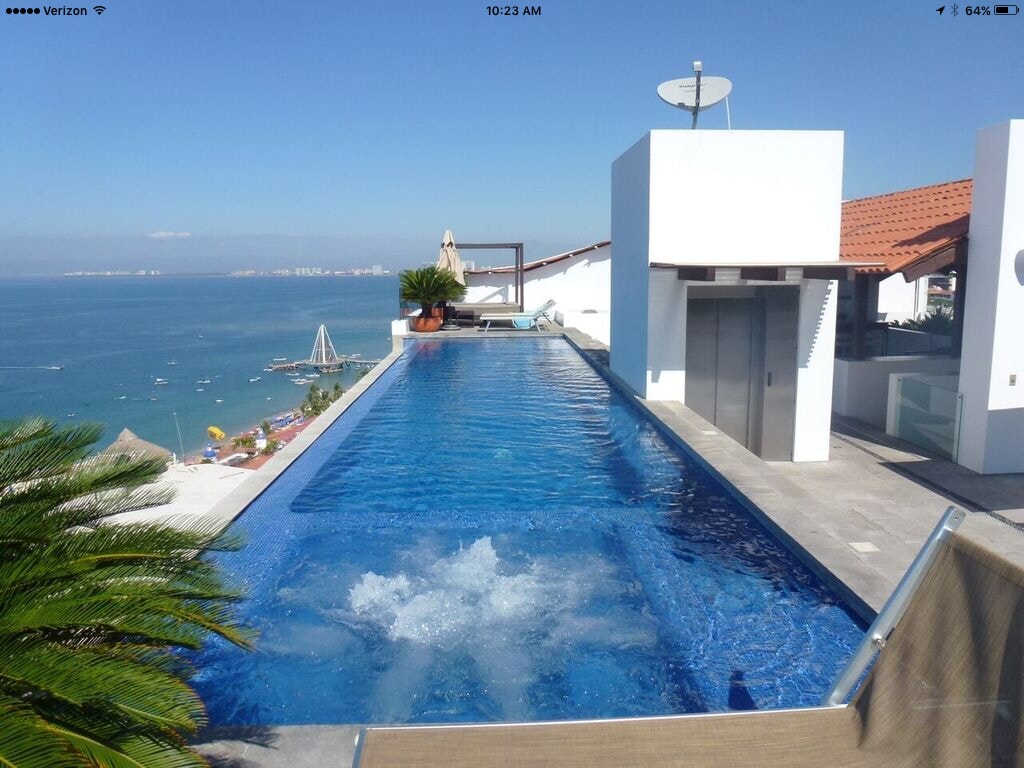 VIEWS! VIEWS ! EVERY ROOM in this unit has full on Water VIEWS! And your own Private Jacuzzi on YOUR OWN PATIO! It is located in AMAPAS 353 a boutique luxury complex WITH A ROOF TOP INFINITY POOL and gym! 1 BLOCK to the FAMOUS Los Muertos beach GREAT LOCATION! In the Romantic zone! A VERY quick walk to all the best restaurants (under 5 minutes!) This lovely home has 1 large King sized BEDROOM and 2 FULL BATHS!!! You will be greeted at the unit and shown the building by the property manager!