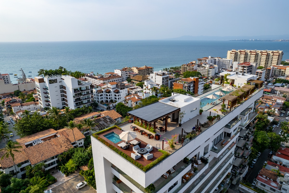Casa Ke’aku is a hidden gem in Puerto Vallarta for those who appreciate art, design, and refined style. Located in the Romantic Zone, just three blocks from the city’s vibrant gay nightlife, it features contemporary Mexican art, curated interiors, and designer furniture. The rooftop boasts ocean views, an infinity pool, jacuzzi, and stylish bar—perfect for sunsets. A stay here is pure inspiration, comfort, and coastal charm. PV is a dynamic city, with buildings everywhere, we have one behind.