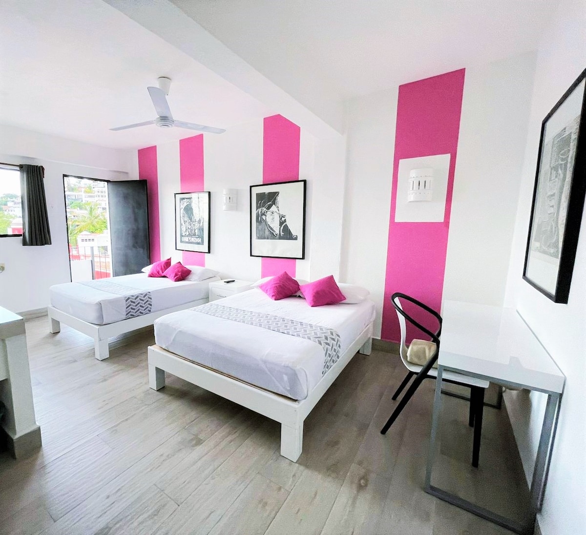 Hotel Belmar twin beds! # 8 es una pequeña y acogedora habitación ubicada en el primer piso de Belmar Hotel Galería ideal para descansar después de un buen paseo por el centro de la ciudad de Puerto Vallarta ó regresar de un hermoso día de la playa. La habitación cuenta con 2 camas individuales, aire acondicionado portátil, TV, WIFI, un balcón con Vista al cubo del hotel, caja de seguridad y baño privado.