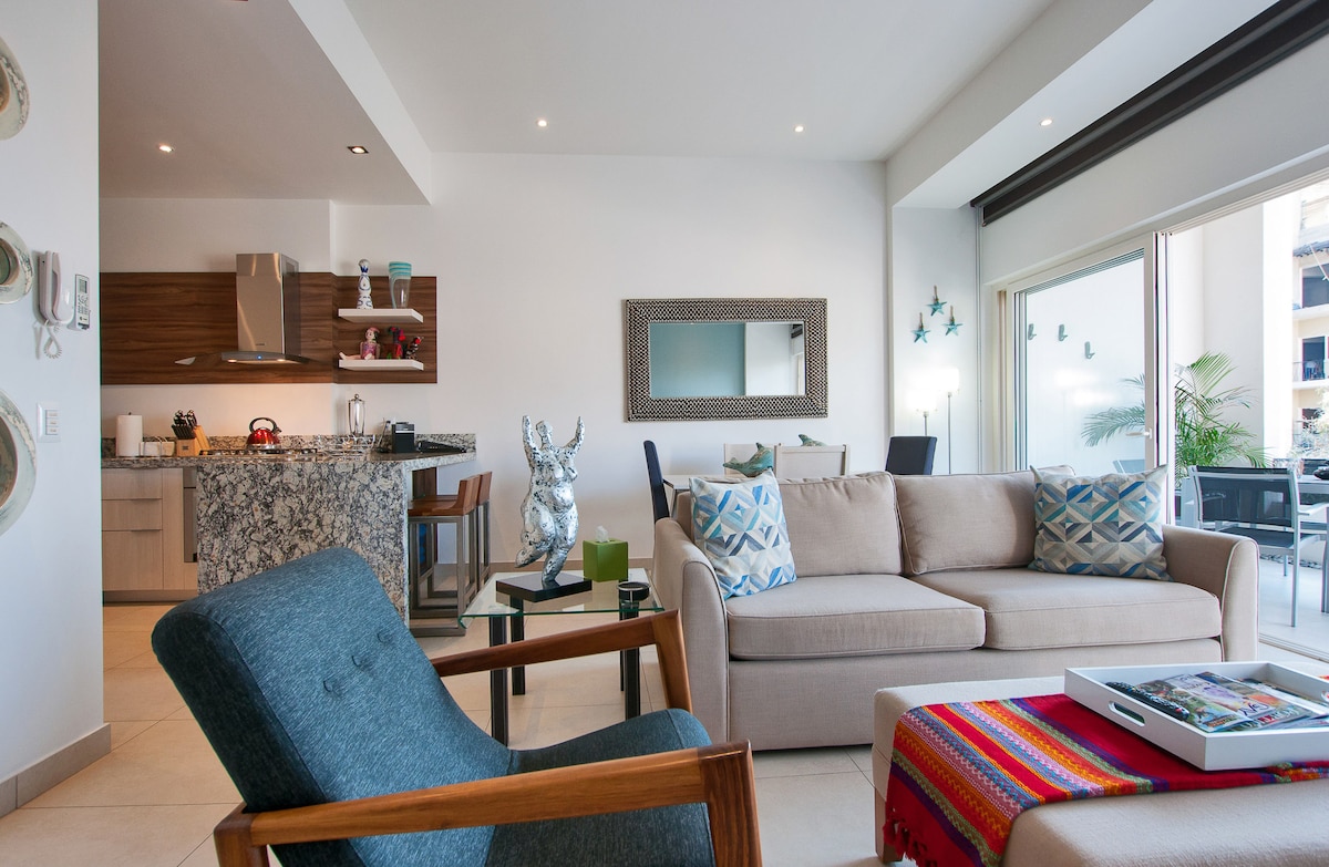 Experience the epitome of beachside living in the heart of PV, mere steps away from the renowned 'Los Muertos' beach. This ground-floor apartment offers accessibility with just a slight ascent of 2 small steps.Your apartment offers a sumptuous king-size bed, the bedroom is your haven for relaxation, equipped with AC for your comfort and a TV featuring different channels in the living room and bedroom. Stay effortlessly connected with Wi-Fi, and savor the convenience of a fully equipped kitchen.
