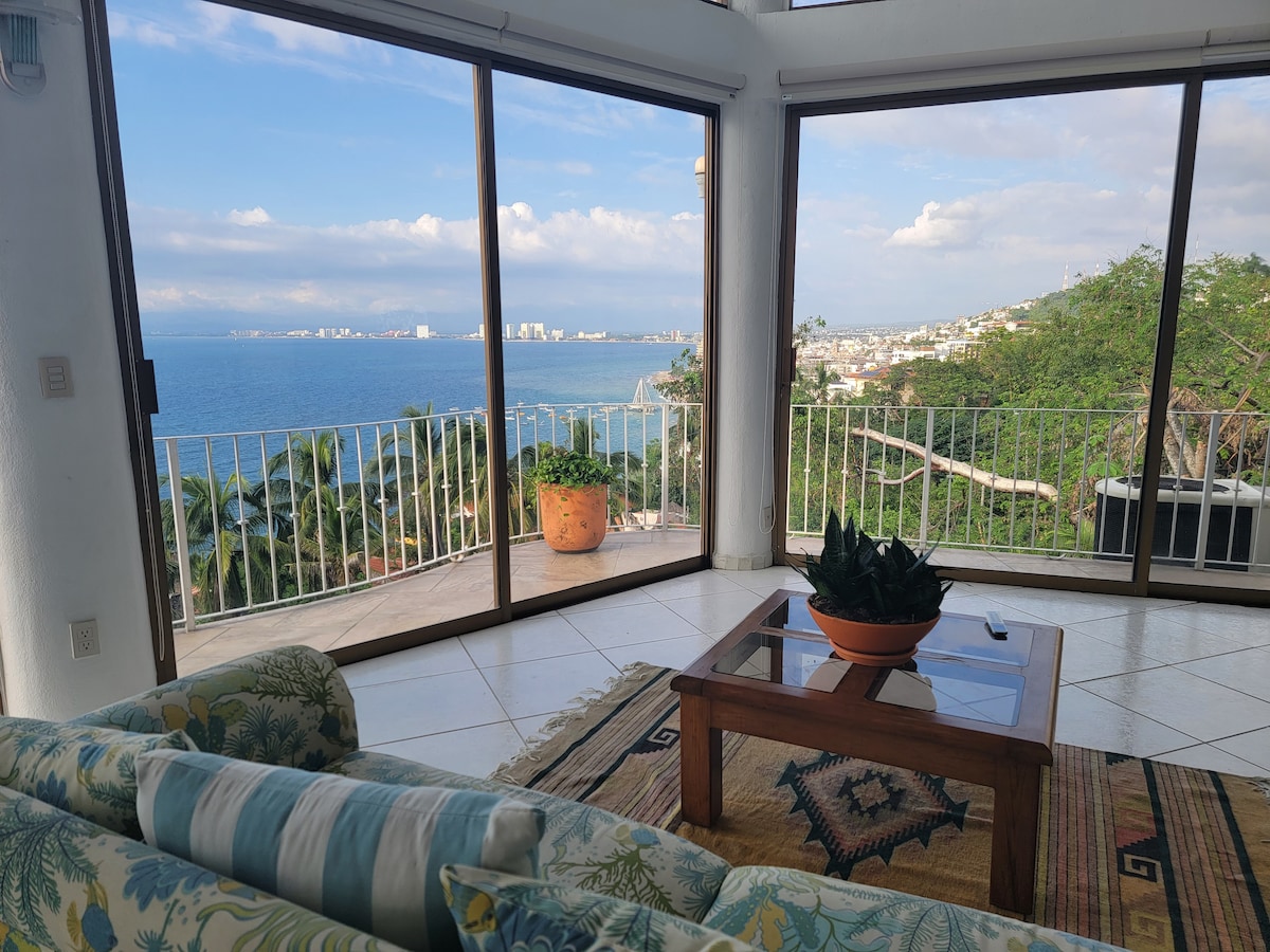 Plunge into the private refreshing pool and marvel at the panoramic views across the bay. This villa reflects old-world Mexican sophistication featuring exposed wooden beams, hand-painted tiles, and colonial antiques alongside contemporary amenities. Our villa sits high on a mountain ridge with panoramic views of the Bay of Banderas, Puerto Vallarta to the north and Los Arcos to the south. The location and collection of villas is widely acknowledged as being some of the best PV has to offer due to the unparalleled location and the gorgeous architectural details of our enclave of villas. This is authentic coastal Mexico -- all the modern luxuries in a stunning setting. It is our paradise and home away from home, and we take great pride in sharing it with our guests! The villa is yours! From front to back and top to bottom! I am always available by email. We also have a property manager in PV, a housekeeper, gardener/pool boy, and regular maintenance services. As a result any issue that comes up can typically be handled quite swiftly by our local staff. Our maid cleans twice weekly as a part of our rate, the pool/garden service occurs every other day, so guests typically have someone to help them and talk to, with any needed manner. Our staff has been with us for many many years and are quite skilled and experienced in serving our guests. This villa is on Puerto Vallarta's South Shore, which is set among mountains covered in a lush jungle next to Banderas Bay. It's an upscale area filled with incredible nature and luxurious homes. Some of the best beaches are right outside the door. Our secluded and exclusive gated villa community is just moments from Puerto Vallarta's charming and historic Romantic Zone, minutes from town and only ten miles from Puerto Vallarta Airport. Cabs are readily available and for $7 you are in town in ten minutes. The coastal road bus stops in front of our villa enclave every 15 minutes, and for $0.50 you can be in town in 10 minutes flat!! Private parking is included. The villas have security on the premises from 7PM to 7AM every day. Any problems or questions that arise in the evening, can be handled by our security staff. For families with small children, we have pack-n-play cribs, boogie boards, beach towels, and other gear needed for guests who love the beach!