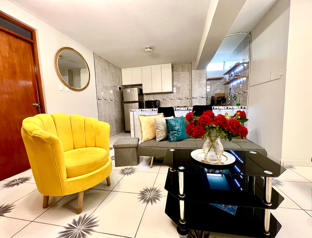 Bienvenidos a nuestro Hermoso, e impecable departamento ! Disfruta de un alojamiento seguro y lujoso, con todo lo que necesitas para pasar unos días extraordinario, al lado de tu pareja o amigos. El departamento ha sido implementado pensando en la comunidad y placer de los huéspedes con equipamiento de excelente calidad. Está ubicado en el 5to piso (no hay ascensor). Disponible lavadora, Está al costado de un minimarket y de lugares cercanos. A 10min del aeropuerto.