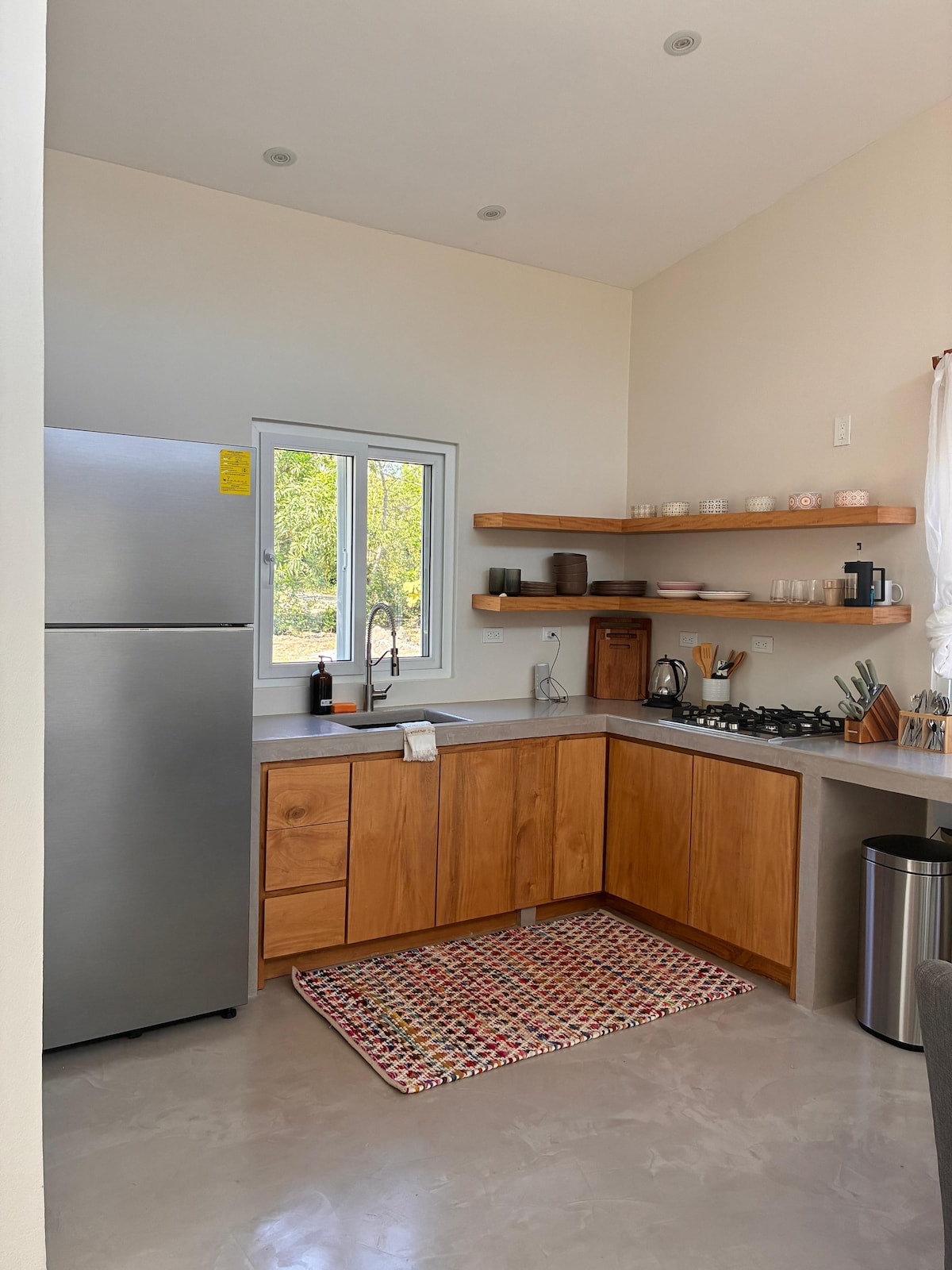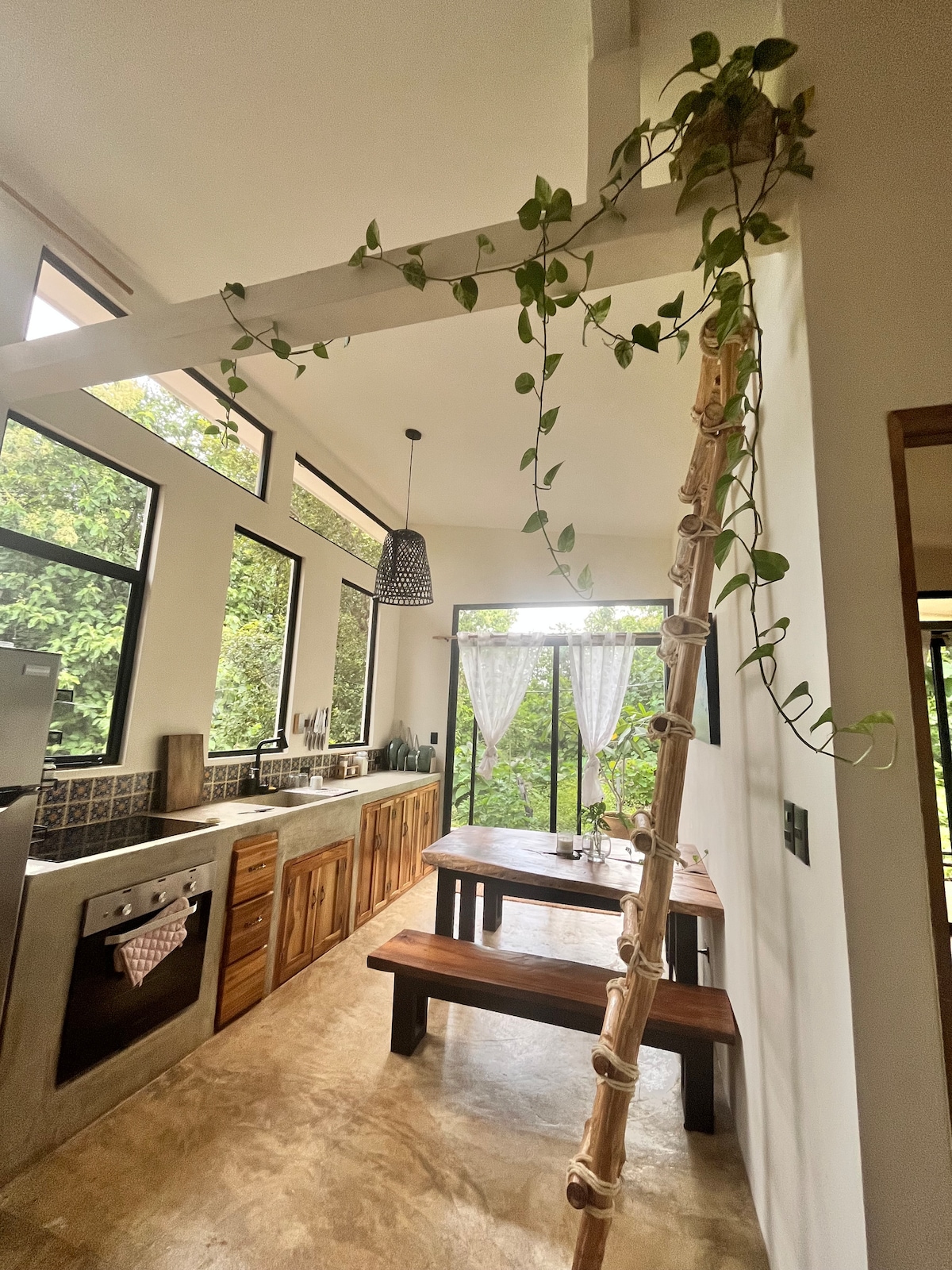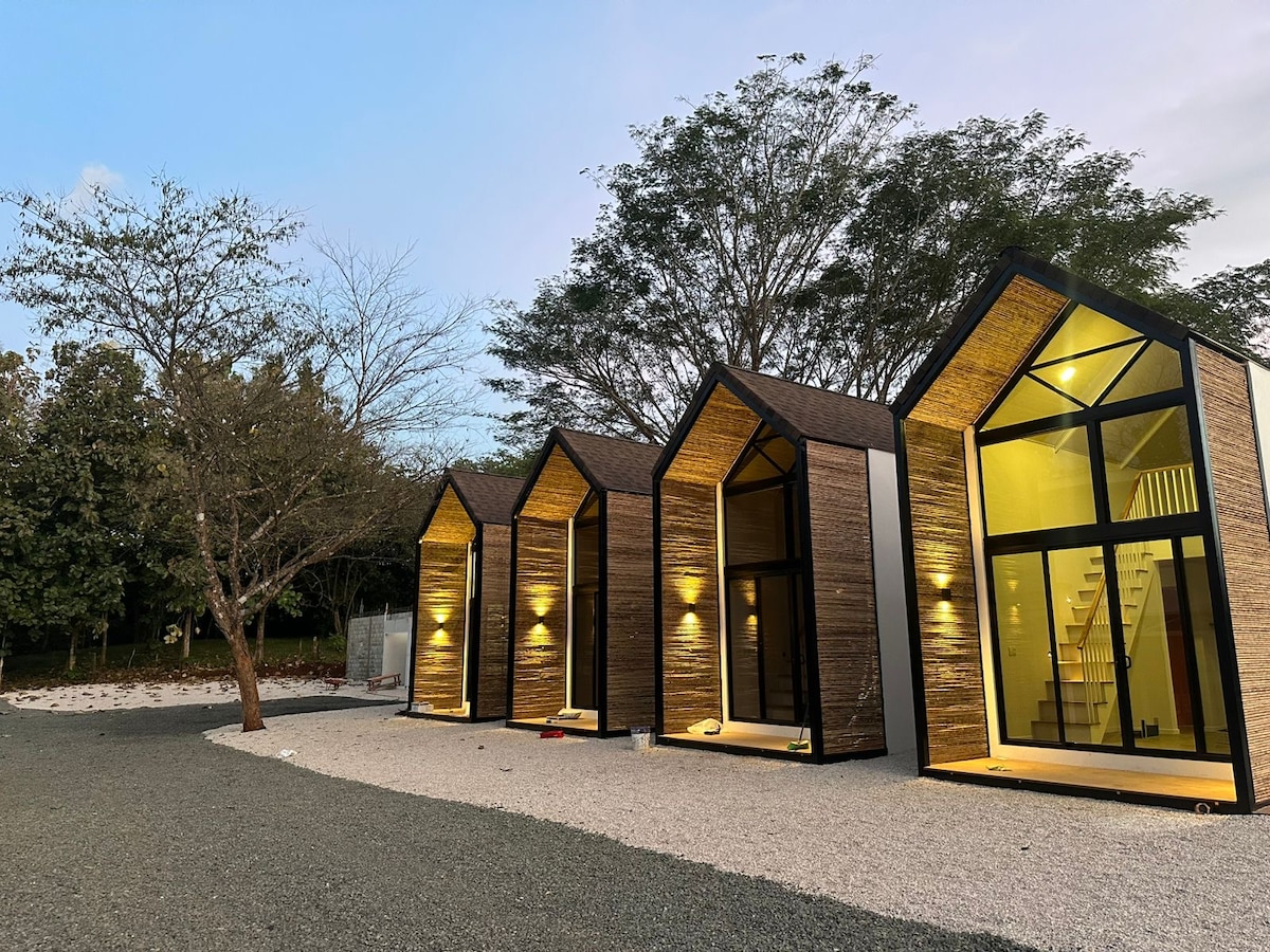 Unique diamond-shaped architecture with stunning triangle windows that let in natural light all day. Fully equipped kitchen — everything you need to cook your own meals. One king-size bed in the upstairs loft and a cozy queen bed downstairs. Beautiful bamboo bathroom with separate toilet and outdoor shower under the sky. Air conditioning to keep you cool. Surrounded by nature and designed for relaxation. Visit our on-site Mycelium restaurant were we serve delicious brunch, lunch, dinner & gelato