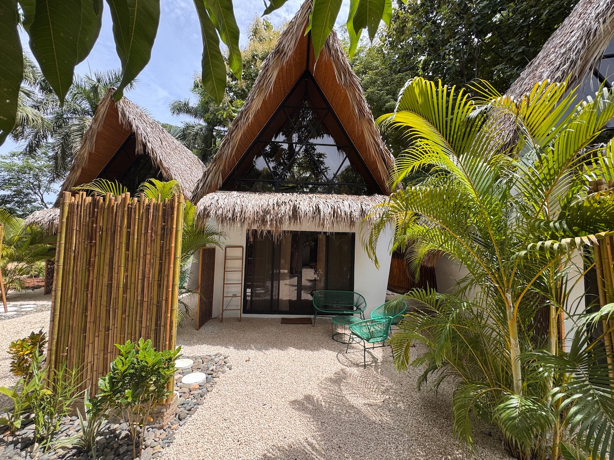 A 1 km de la playa, pequeños bungalows privados tipo loft, equipados para disfrutar cómodamente su viaje. Estamos cerca de lindas playas como Avellanas, Junquillal y a 1 km de Playa Negra (2 min en auto), una de las mejores olas de Costa Rica. Además a poca distancia caminando de restaurantes y minimarkets. Cuenta con Wifi de alta velocidad, A/C, cocina equipada, cama Queen, ventanas PVC herméticas,sofacama personal ,baño privado Con agua caliente y terraza propia.