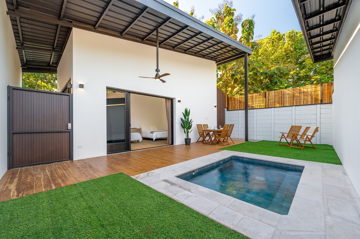Modern, newly renovated house located in tropical Jardín de Los Mangos. 10 minutes from Santa Cruz, 30 minutes from Tamarindo and 30 minutes from Playa Avellanas. It has one queen bed, one sofa bed, spacious bathroom with luxurious walk-in shower and a fully equipped kitchen. Amenities include air conditioning, smart TV (apps only, no cable) and high speed internet. Access to large pool, gas and charcoal grill, dining rancho, pool table and outdoor shower. Free parking