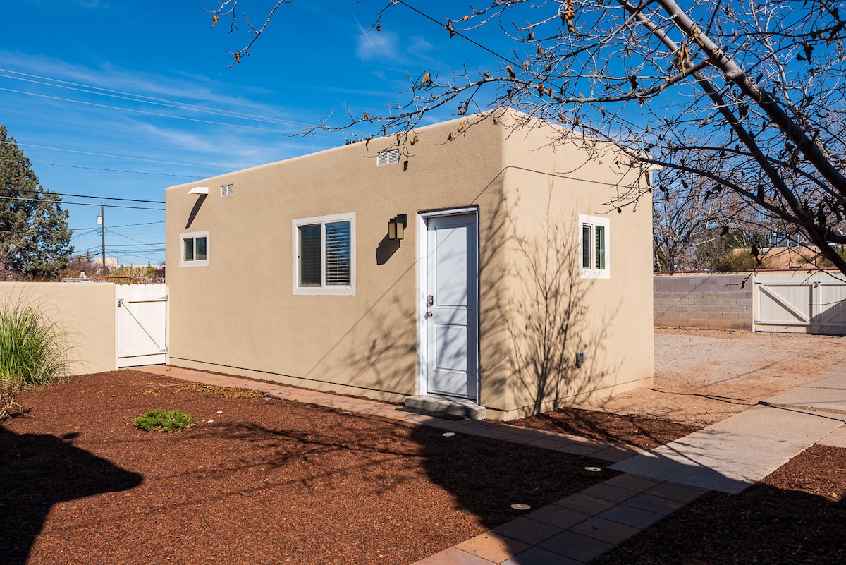 This modern southwest casita sits snuggly on our 1923 historic adobe property blending olde materials and modern amenities. Artist constructed; it brings a modern twist to your Albuquerque adventure. Casita is Spanish for little home, and this casita is entirely a home. Featuring full kitchen, King bed, a waterfall shower, private patio and pocket entryway doors that merge NM's beautiful outdoors with our cozy indoors. Permit:052140