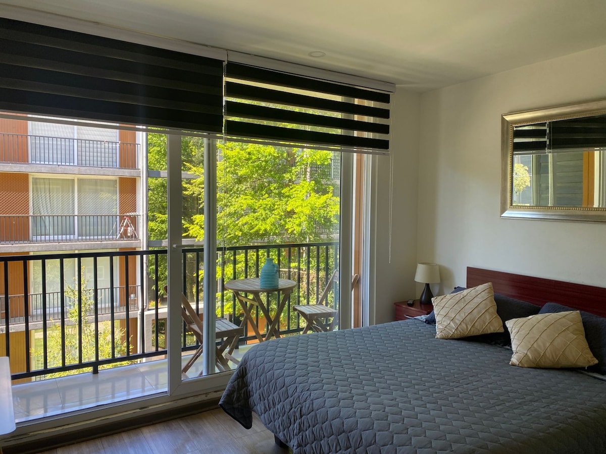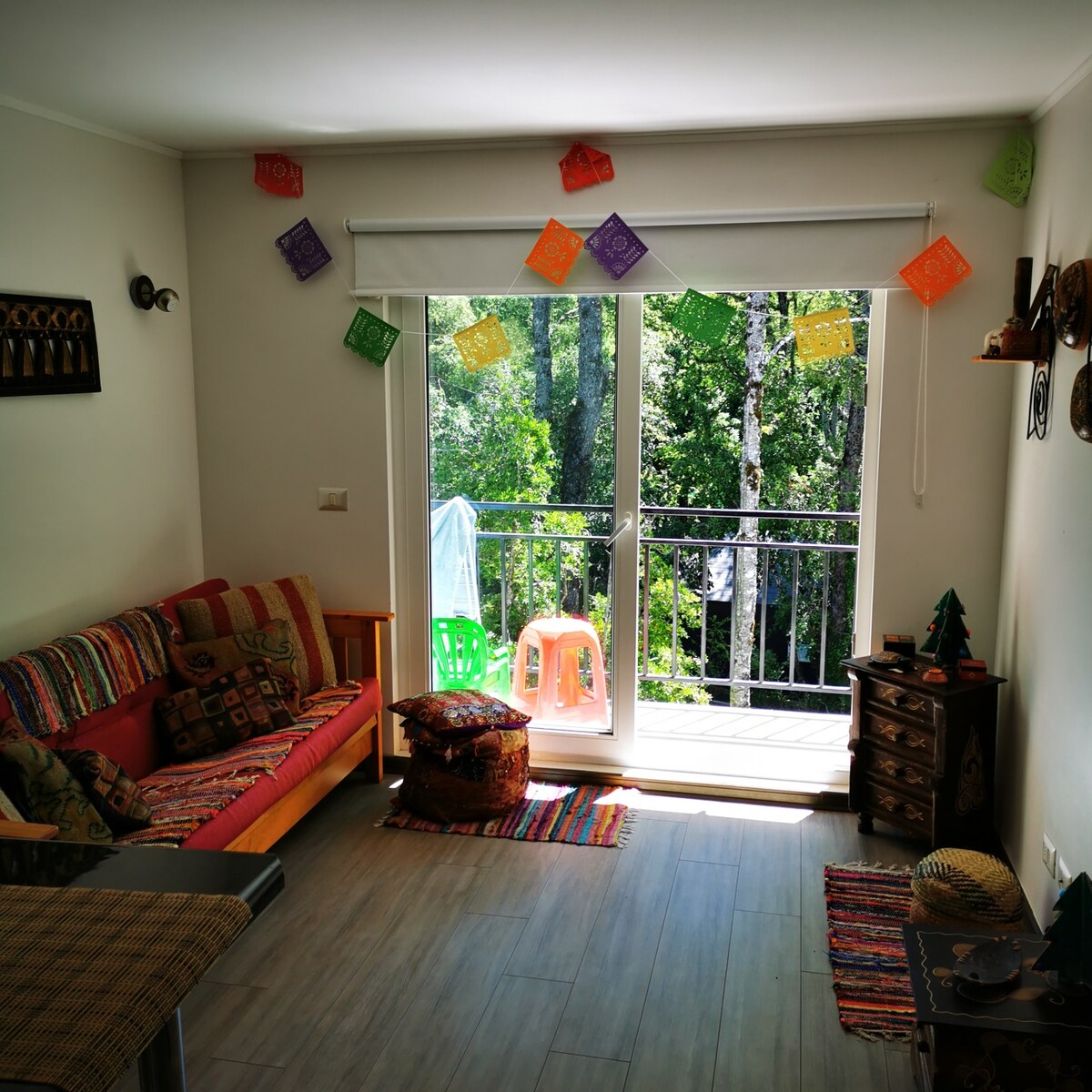 Cozy one-bedroom apartment with en-suite bathroom, living-dining area, and open kitchen, located in a private condo with beautiful gardens. Perfect for 2 guests. Enjoy: 🏊♂️ Pool suitable for kids and adults 🏰 Playground for children 🌲 Club house 🧖♂️ Sauna and hot tub (extra fee) 📍 Ideal location, close to: 🏘️ 5 min from downtown Pucón 🏞️ Beaches ⛷️ 25 min from the ski center ♨️ 40 min from Huife hot springs 🌿 25 min from botanical thermal park 🌄