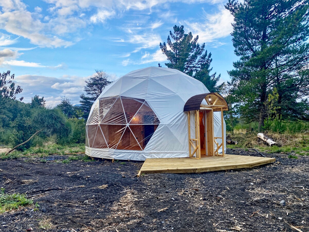 Primero agradecer por la intención de conocer mas al detalle nuestro acogedor Domo con vistas al Volcán Quetrupillán de día y al espacio cósmico por la noche. De acceso directo y rodeado de naturaleza autóctona, el domo esta completamente equipado para hacer de tu estadía en perfecta armonìa con el entorno natural. Rodeado de lagunas ocultas y otras de uso exclusivo, saltos de agua y cascadas a pocos minutos y el rio Huililco que con el sonar de sus aguas, entre sus piedras, dormirás cada noche