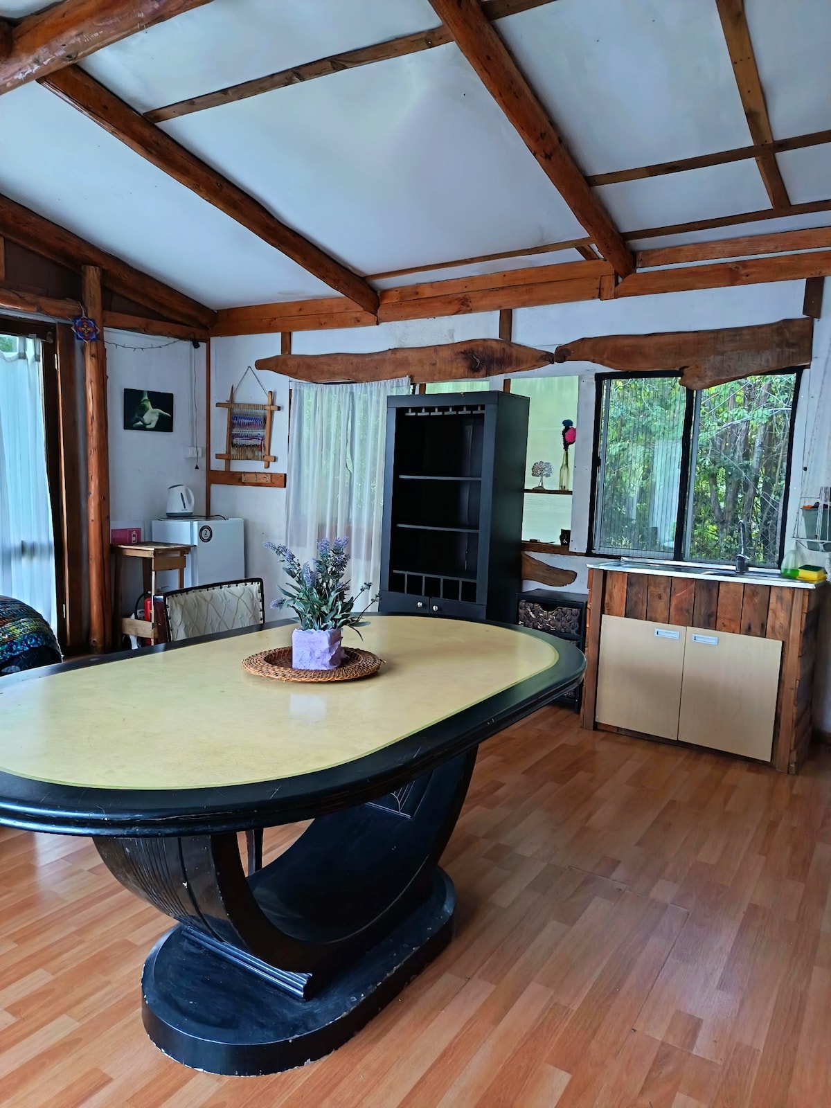 Pequeña cabaña rodeada de árboles frutales y naturaleza muy acogedora, el dormitorio matrimonial está en una buhardilla, un sofa cama en el primer piso, con terraza , piscina , estacionamiento y pequeña parrilla, ideal para un matrimonio sólo , con un hijo o acompañante.Disponemos de lavandería el costo por 10 kgs. es de $ 5.000.- incluye secado. La calefacción es solo para el invierno. Arrendamos kayac para 2 personas y Canoa canadiense