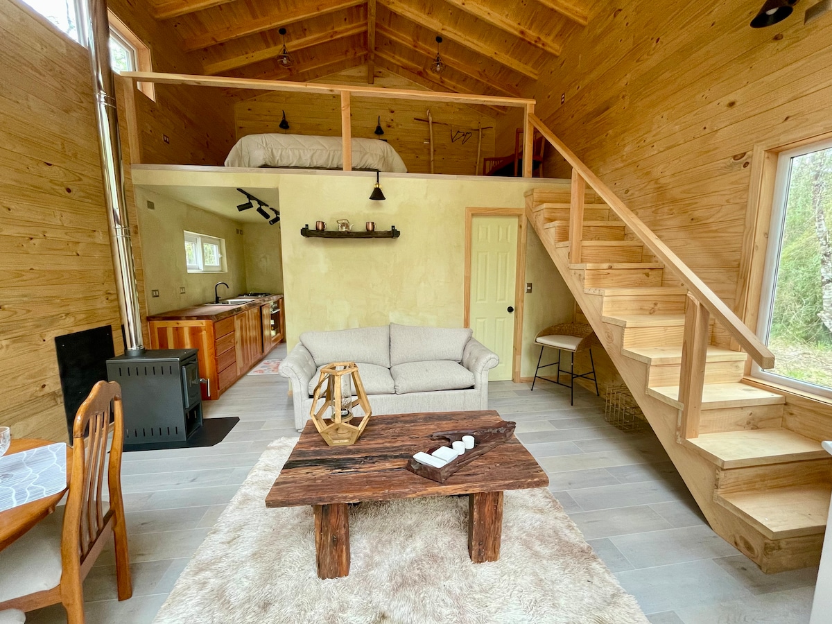 Cabaña de lujo tipo loft con finas terminaciones, inserta en un bosque centenario de arboles nativos. Baño en suite, walking closet, cocina integrada completamente equipada. Combustión a leña, estufa toyotomi. Gran terraza, parrilla, mesa en el bosque para asados, piscina, estacionamiento privado, smart tv, netflix, tv cable y wifi fibra optica.