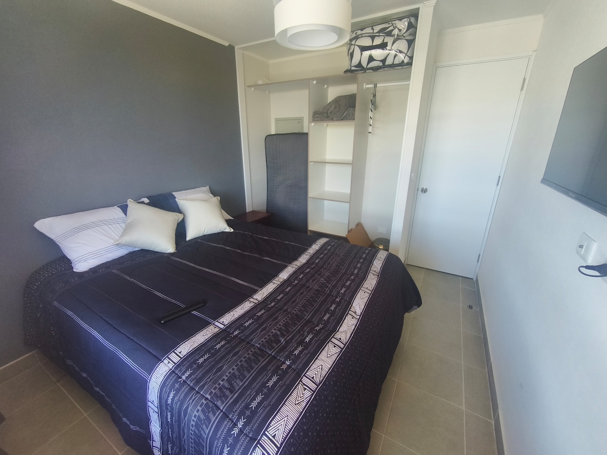 Relájate en un lugar con hermosas áreas verdes ,camino al volcán km 1 cerca centro de sky y centro de pucon. Dpto totalmente equipado , 1 dormitorio con cama king . Living con sofá cama para 2 niños , calefacción , Wifi TV , estacionamiento ,Terraza y piscina . Club house : Juegos electrónicos para niños Gimnasio ,bicicletas (sin costo ). tinajas , quincho ( costo adicional) lavandería (lavadora y secadora ) costo adicional (monedas de 500 pesos ) Conserjeria 24/7
