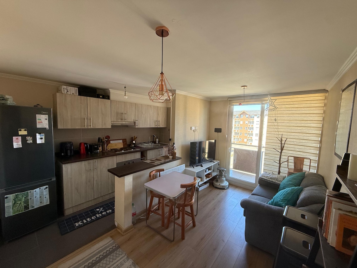 Disfruta de la funcionalidad de este departamento nuevo, central, tranquilo, cercano a los mejores restaurantes de Isla Teja, muy bien equipado y cómodo, estacionamiento exterior. Puedes acceder caminando a: - Mercado Fluvial 10 min - Casino Dreams 10 min - Plaza de la República 10 min - Jardín Botánico UACH 5 min - Parque Saval 15 min - Museo Naval Submarino O’brien 15 min A 2 cuadras de locomoción para acceder a Cervecería Kunstmann, Feria Costumbrista de Niebla y costa Valdiviana.