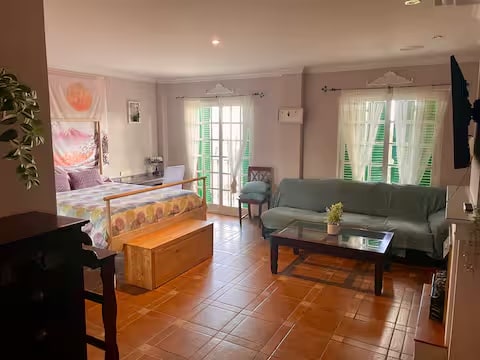 Acogedor estudio privado en jardín, con acceso independiente desde la calle. Con baño propio y equipado para preparar el desayuno. Incluye un porche ajardinado, en uno de los entornos más tranquilos de la ciudad: una zona residencial rodeada de naturaleza a unos 15 minutos del centro en vehículo.