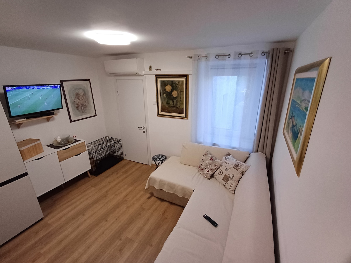 The apartment has a spacious terrace with sea view, two separate rooms with double beds, a fully equipped kitchen, dining area, television, shower and toilet, internet and free parking in the yard. Several spacious sandy beaches are located 100 m down the house as well as other varied beaches such as smaller, rocky, intimate ones. Right next to the nearest beach is a promenade by the sea with a beautiful view which leads to the center of the old town of Rab. As well, nearby are numerous facilities such as beach bars, restaurants, massages, ATM, bakeries, a food store, shops, taxy boots and some of sports for adults and children, such as every morning free exercises with a trainer in the sea, children's parks and organized outdoor playgrounds, pedal boats, kayaks and similar facilities.