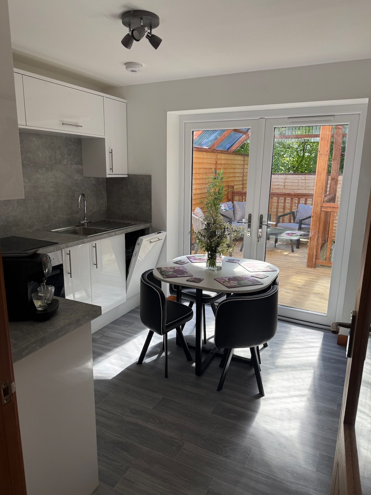 Newly built and finished to a high standard, enjoy a stylish experience at this centrally-located one bedroom private guest space. Located in the Royal Burgh of Tain, off the A9 & NC500 route, this well equipped space is situated in a family garden with off road parking. The self contained building boasts, a double (UK standard) bedroom, shower room and kitchen/diner/sitting area. Large patio doors lead out to the decked area in the garden. 35 miles north of Highland capital Inverness.