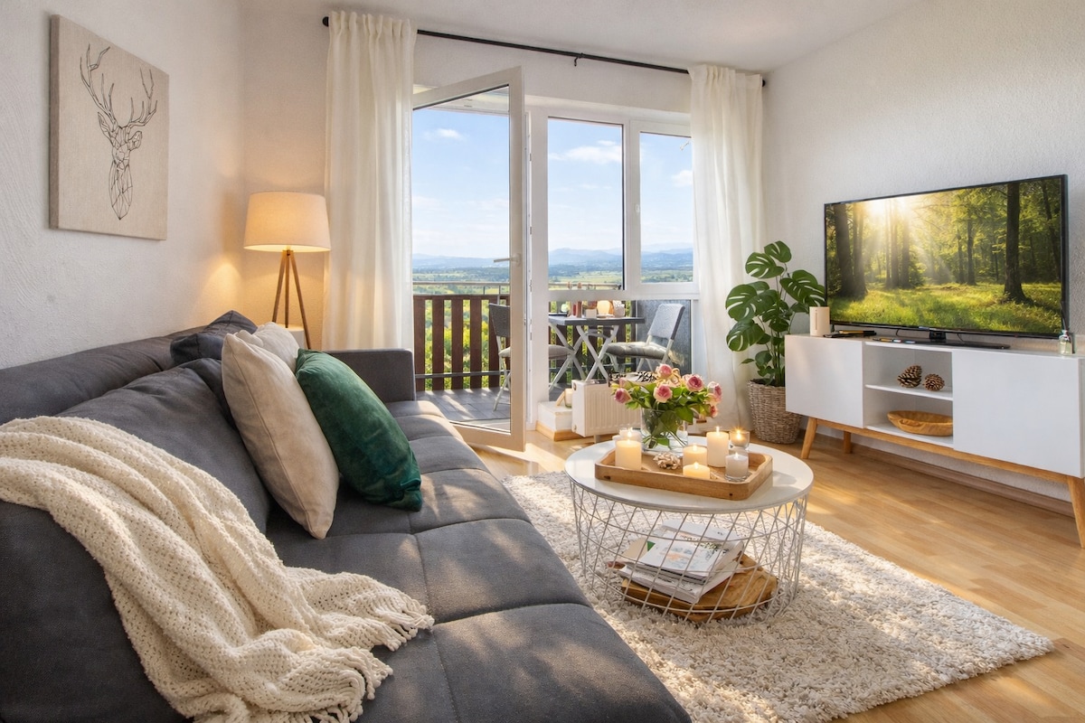 Dieses stilvoll eingerichtete Apartment liegt direkt auf einem Berg, mitten im Grünen, am Ortsrand von Schwarzenberg. Dich erwarten Ruhe, Natur pur und ein atemberaubender Blick über das Erzgebirge. Genieß die Zeit zu zweit oder sehr gern in Familie. Die Wohnung befindet sich im ersten Obergeschoss und kann auch mit einem Aufzug erreicht werden. Schnelles WLAN und ein Parkplatz steht kostenfrei zur Verfügung. Handtücher und Bettwäsche sind inklusive. Genießt den Aufenthalt!