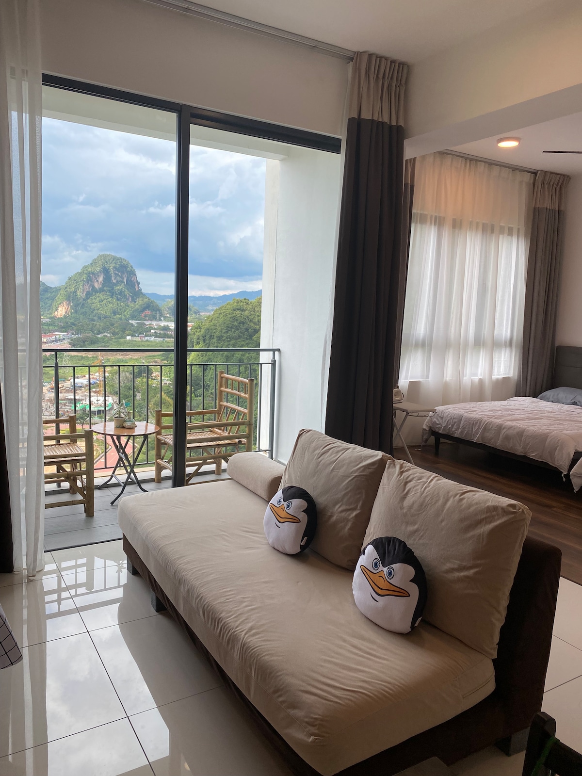 A calm & peaceful studio surrounded by greenery mountains and a natural hot spring pool is available on the facilities floor~ 3 minutes walking distance to Lost World Tambun ticket counter. Parking spaces are available free of charge. Self-check in & self-check out with lockbox. ■ Infinity swimming pools, gym, sauna, snooker room & kid's playground facilities ■Fast food restaurants (McD's, KFC, Starbucks), TF supermarket & coin laundry nearby