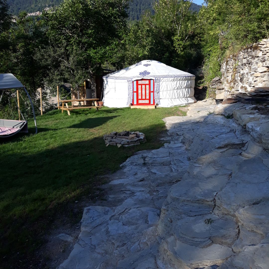 In the calm of the mountains, in the middle of a pristine nature, our yurt offers a spacious, luminous, comfortably equipped and cozy living and sleeping space. The frame is made from bamboo which creates remarkable aesthetics within the interior. The yurt is surrounded with private areas beneath old trees, in Sun and shadow, at the creek and on one of the natural stone terraces; an inviting environment for rest, contemplation and communion with nature. Great hiking possibilities nearby.