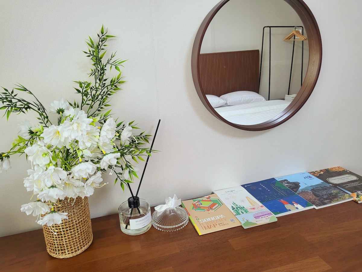🧳무료 짐보관 서비스 🏠 거실 / 큰 방 침대 2개 (퀸사이즈 침대,슈퍼싱글 침대 ) / 작은 방 침대 2개 (싱글사이즈 침대 2개) / 화장실 / 스마트TV / 블루투스 스피커 💯 잠실의 가장 중심부에 위치, 롯데타워,석촌호수,롯데월드 도보 10분 이내 📍 잠실(바로 앞) 강남 (10분) 홍대(20분) 명동(30분) 이태원(30분) 💬 English available host/ hôte disponible en français 환영합니다. dew house입니다. 서울의 명소를 30분 내로 연결하는 2호선 잠실역& 8호선 석촌역 도보 5분의 한적한 주택가에 위치해있습니다. 석촌호수, 롯데월드, 롯데월드몰&타워, 송리단길 모두 도보로 이동 가능하며 석촌호수 카페거리와 방이 맛골과 인접하여 유명한 먹거리들을 모두 경험하실 수 있습니다.