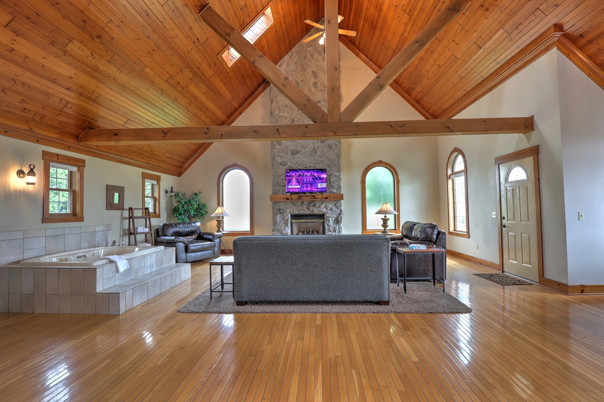 A quaint, cozy newly remodeled in 2025 cabin on 60 wooded acres perfect for a couples getaway. 8 minutes to a great downtown for shopping unique boutiques, dining, local wineries, breweries and distillery! Enjoy peace & tranquility in natures setting. Cozy up to a massive stone wood burning fireplace both inside and on the screened in porch. The brand new private hot tub boasts natural spring water and is just outside the door from the cabin and overlooks the natural spring ponds.