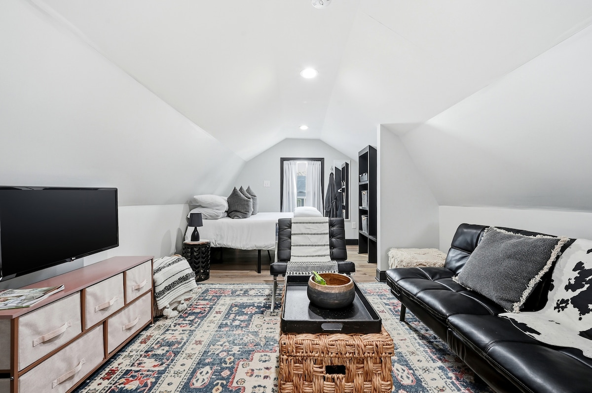 Escape to a tranquil haven in this stylish, quiet, second story studio space. Nestled in a peaceful neighborhood, this thoughtfully designed retreat offers a haven of relaxation. This well-appointed space features a cozy living area with a plush sofa and flat-screen TV, kitchenette (convection/microwave oven, hot plate, refrigerator, and cooking essentials), a comfortable queen-size bed adorned with crisp linens and plush pillows, a bathroom with large walk-in shower, and beautiful views.