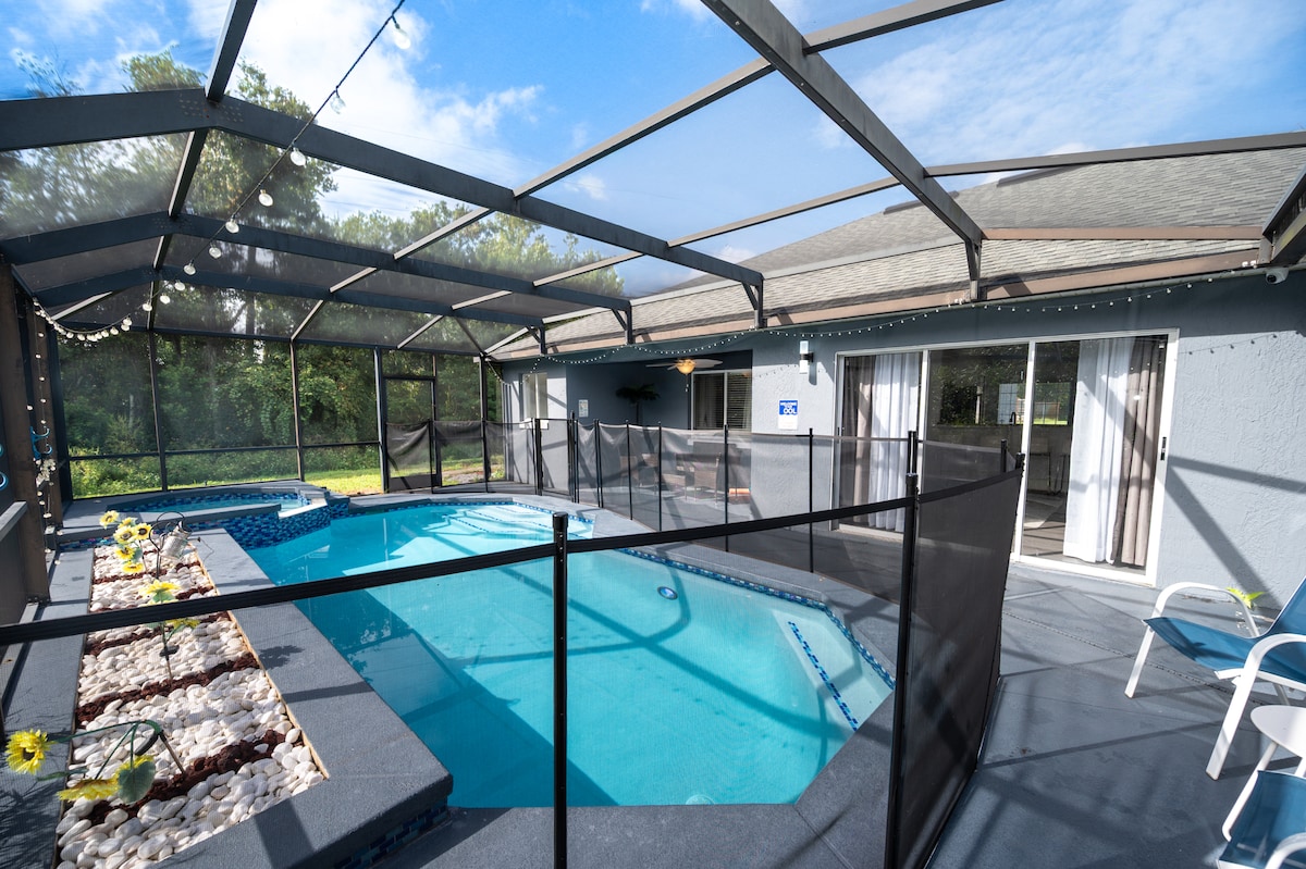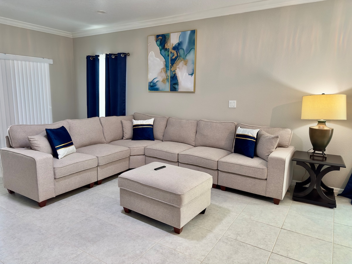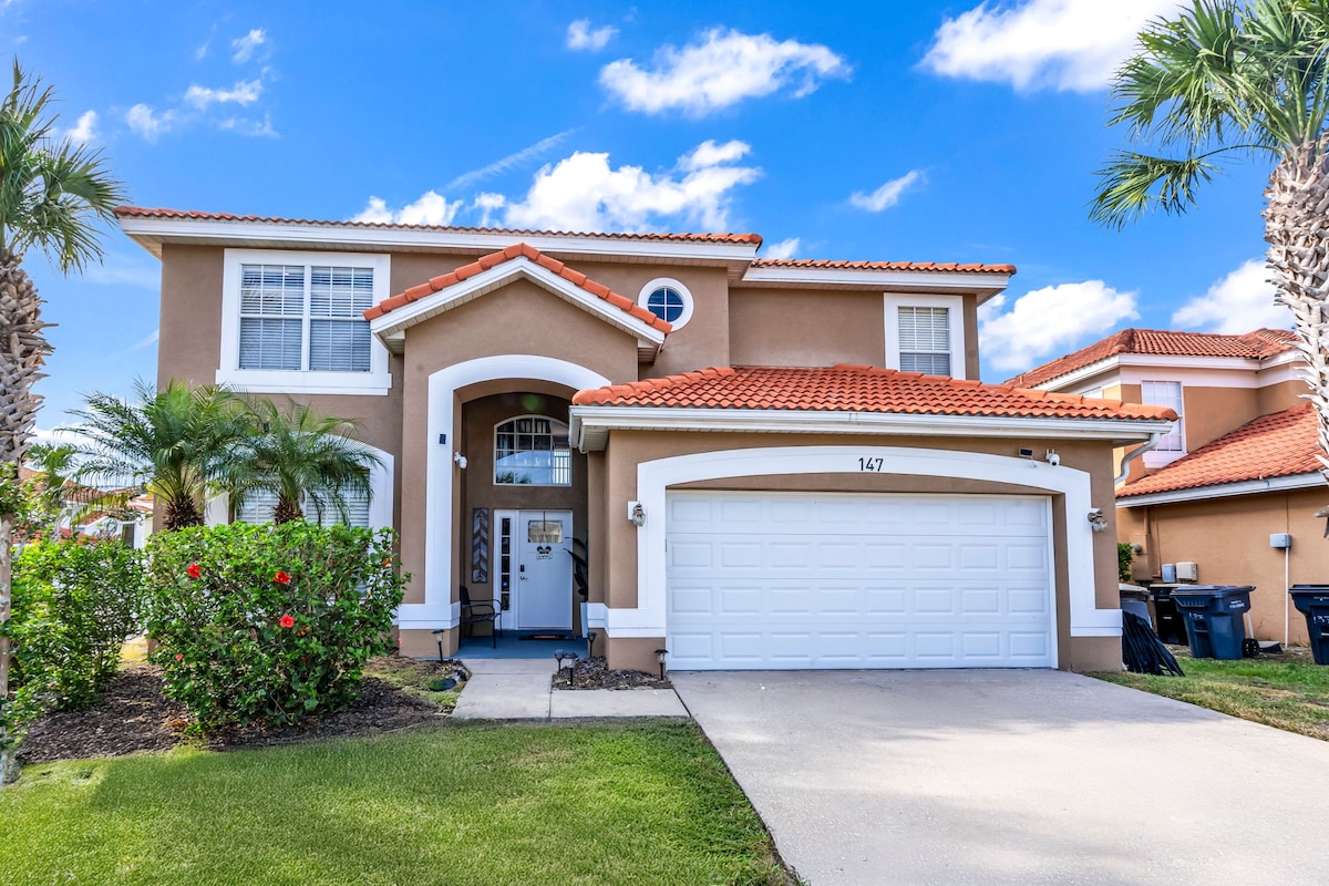 Esta hermosa casa de 5 habitaciones y 3 baños equipada completamente para un espléndido disfrute. Tiene una excelente ubicación cerca de una variedad de restauraste, comidas rápidas, centros comerciales, supermercado, a tan solo 10 millas del fabuloso parque de Disney Word y 18 millas del parque de Universal studios. tiene piscina privada con calefacción, cocina completa, nevera para vinos, parrillera, sala de juego y su sofá cama. Tiene un balcón donde podrás relajarte y leer un libro.