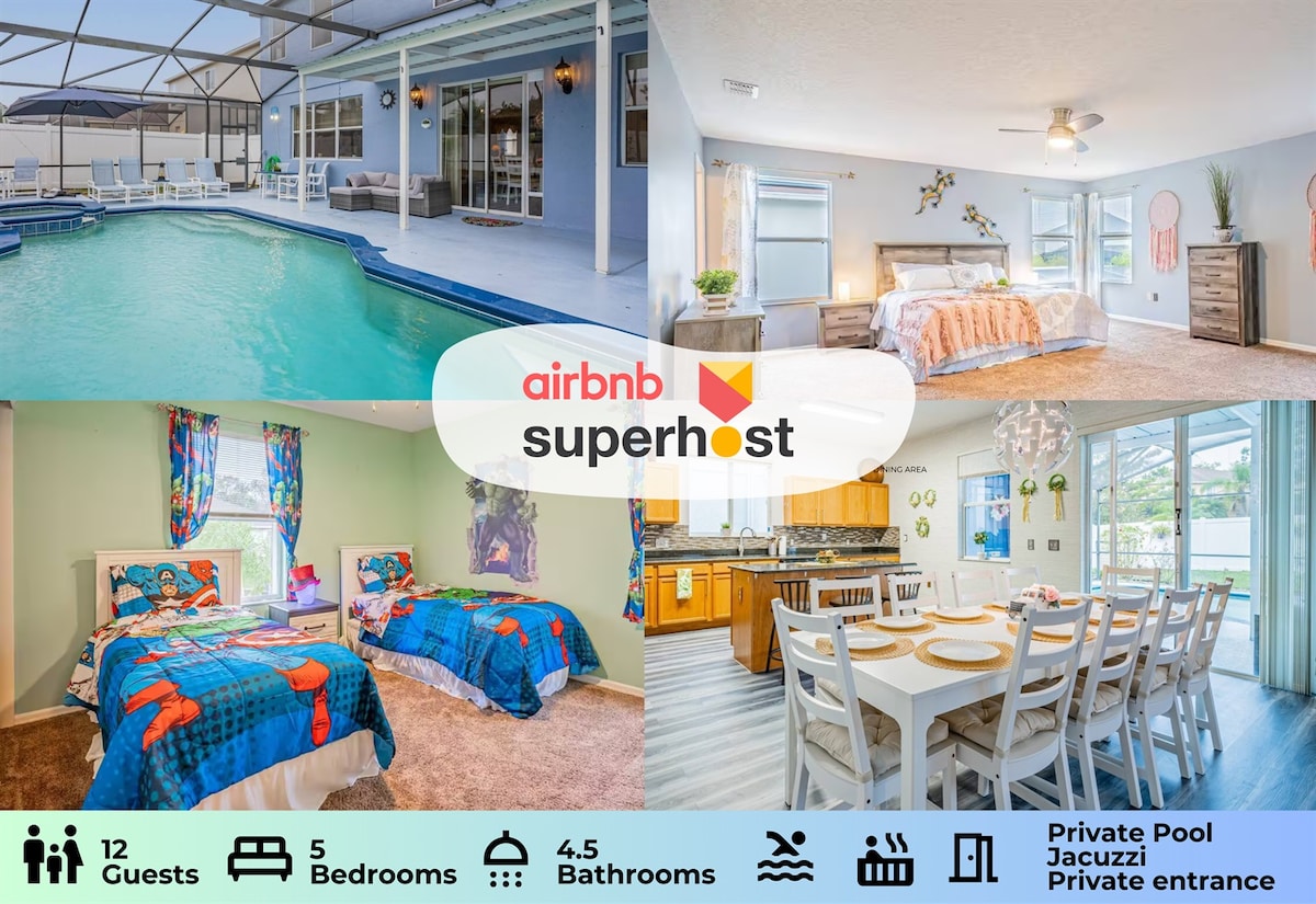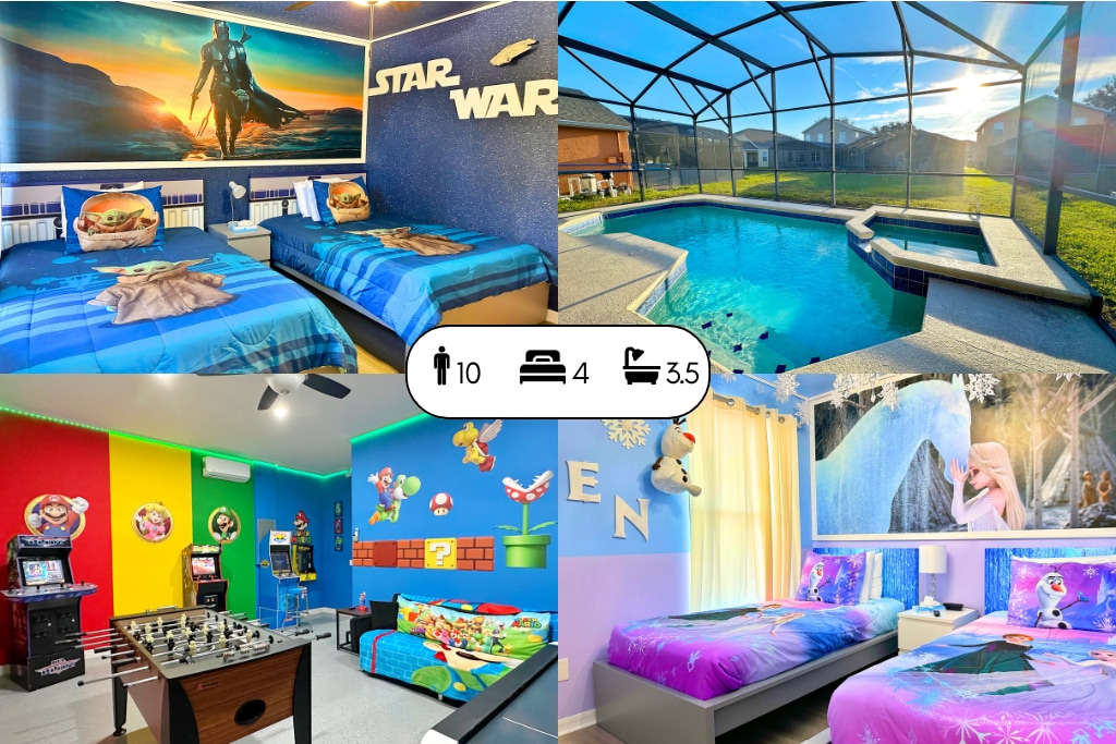 ★ WELCOME TO IMAGINATION STATION★ Located centrally to Disney, SeaWorld, Universal Studios, Legoland & other attractions, this custom Disney-themed 5 bed/4 bath home has everything your family needs for a dream vacation! Enjoy all the free community amenities including resort style pool, spa, lazy river, mini golf, gym, and much more ✴ 9 miles to Disney World ✴ 23 miles to Universal Studios
