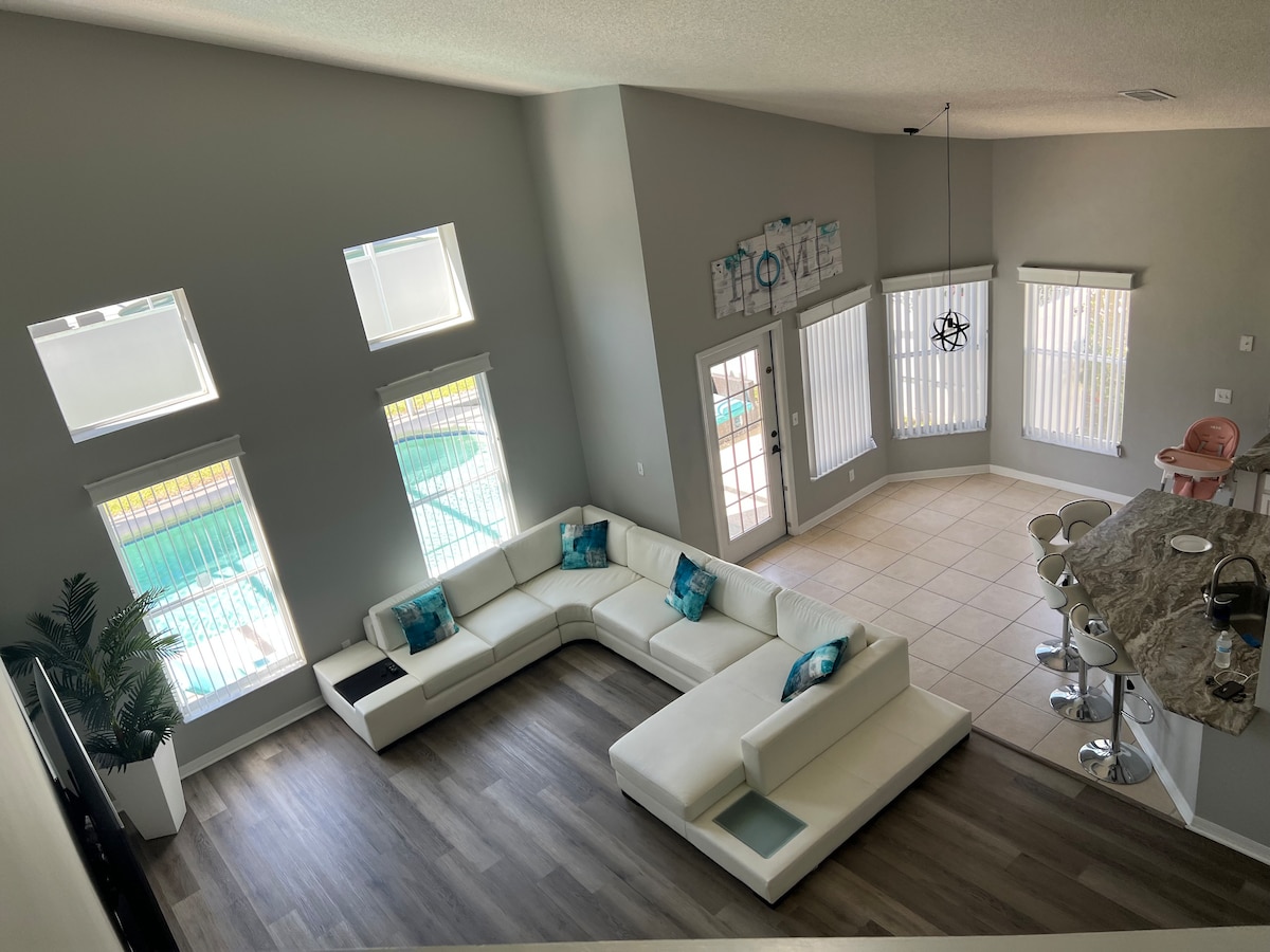 Sit back and relax in this stylish home with all the amenities you need for a fun family getaway. This home has a spacious layout with 3 bedrooms and 2 baths. We have thought of everything so you don't have to-toiletries,washer/dryer, and wifi. Enjoy your morning coffee in the screened in pool area with a beautiful sunrise and lake view or sip a glass of wine while floating in the pool. Just minutes to Theme Parks and major highways, this is the dream home you have been waiting for!