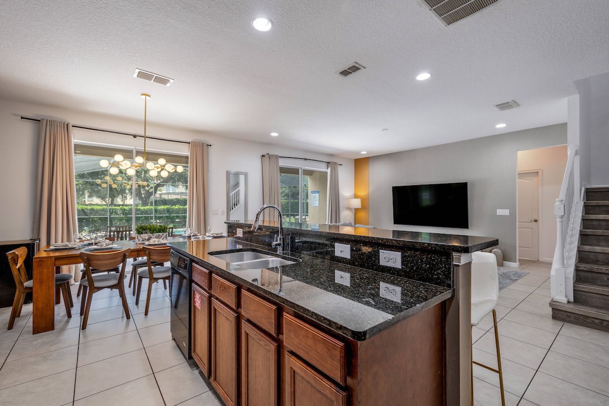 Escape to your luxurious Mediterranean villa! Perfect for 10+ guests, Level 2 EV Charger with free off-peak charging, pet & kids friendly 6-BR, 4.5-bath home offers ultimate comfort. Enjoy a private heated pool, game room & TVs in bedrooms. Nestled in a secure gated resort, enjoy the resort pool & spa, gym & playground. Our villa also features a gas BBQ grill & baby-friendly amenities. Ideal for families or business travelers. Close to all major theme parks. Book your unforgettable escape today!