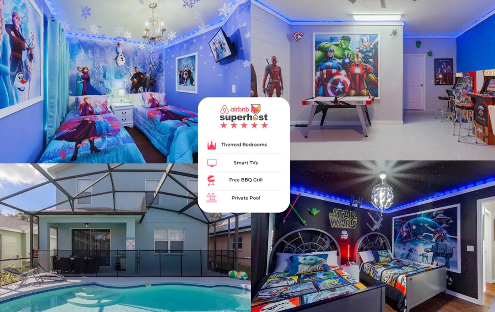 Unable to book this house? Don't worry! Check my profile for similar homes that might suit your needs WE HAVE 24/7 CUSTOMER SERVICE! Disney is 10 miles away! Beautiful single-family themed house with a fully equipped kitchen. Experience endless enjoyment with your loved ones in a private game room, complete with multiple arcades, a foosball table, and an air hockey table. Relax while having a BBQ with your family next to a private pool. Shopping malls, restaurants, and attractions are nearby.