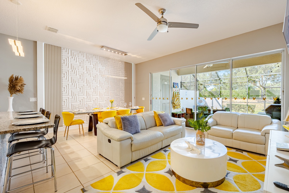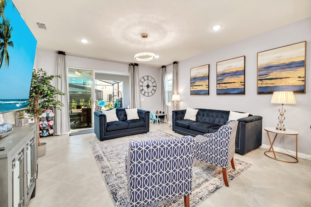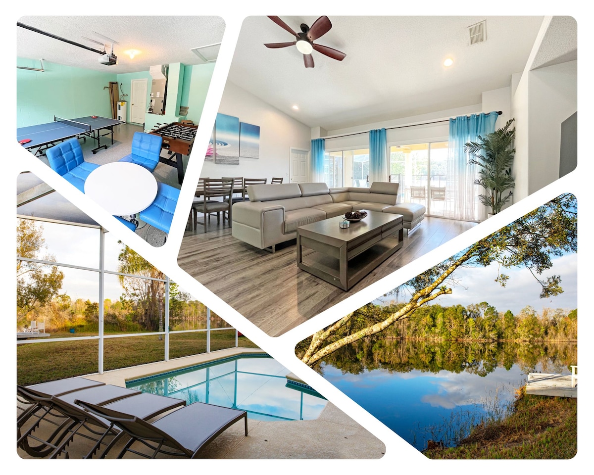 Sit back and relax in this stylish home with all the amenities you need for a fun family getaway. This home has a spacious layout with 3 bedrooms and 2 baths. We have thought of everything so you don't have to-toiletries,washer/dryer, and wifi. Enjoy your morning coffee in the screened in pool area with a beautiful sunrise and lake view or sip a glass of wine while floating in the pool. Just minutes to Theme Parks and major highways, this is the dream home you have been waiting for!
