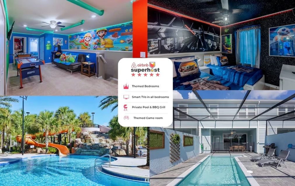 This stunning Storey Lake Resort Villa is the perfect getaway to relax and enjoy your time in Orlando, Florida. Just minutes to Disney World & within easy reach of attractions, shopping and dining. This immaculate & exceptional villa has a heated pool and spa (no additional charge) to relax in after a busy day at the parks. Family friendly featuring Super Mario & Frozen bedrooms, as well as three king size bedrooms, along with a Harry Potter themed movie loft & Spider-Man themed game room!