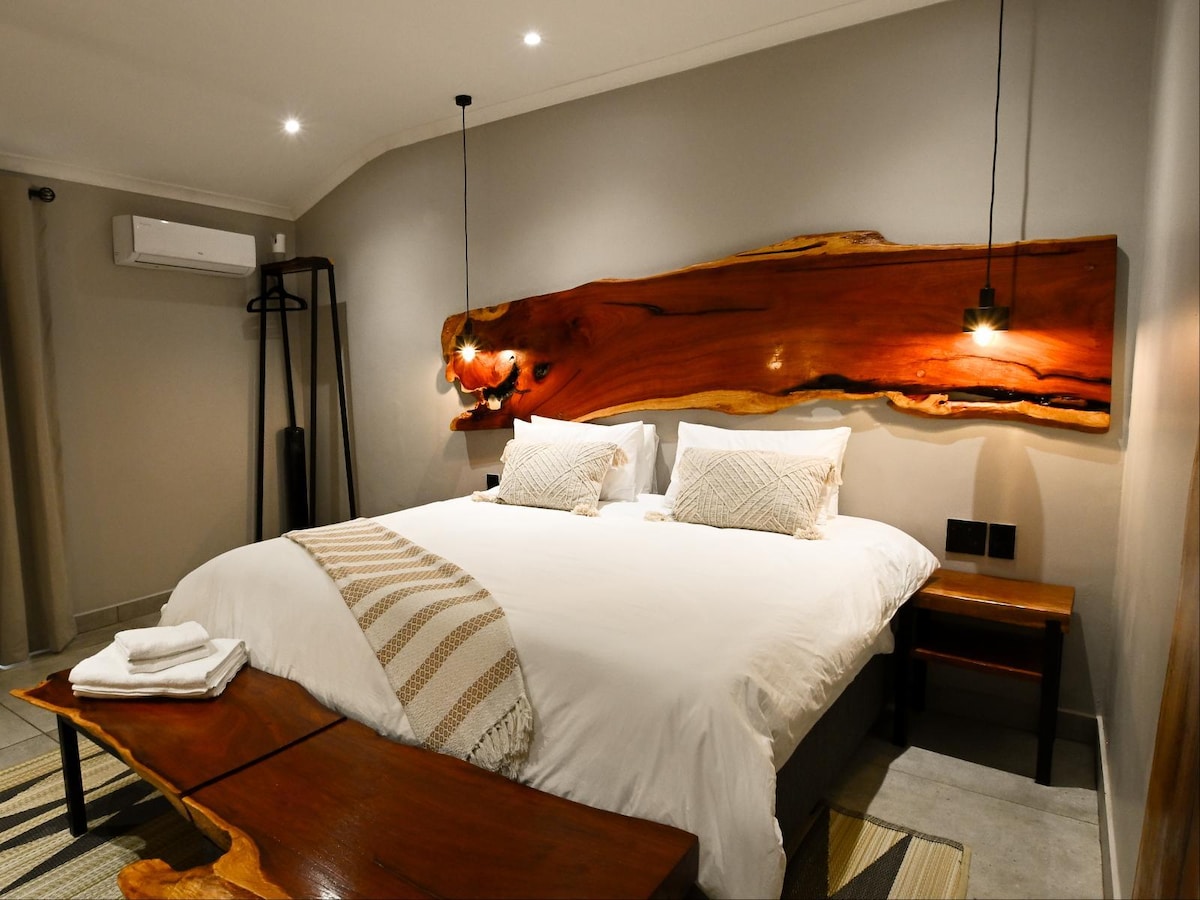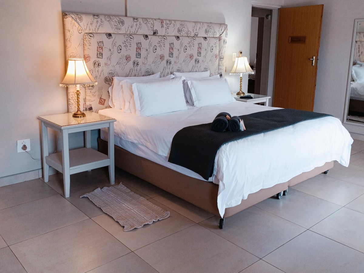 A spacious air-conditioned room with a king-size bed that can be converted into twin beds. The en-suite bathroom has a shower and bath. The room has a TV with DStv, free Wi-Fi, a bar fridge, and coffee/tea facilities. Sliding door leading to the garden.