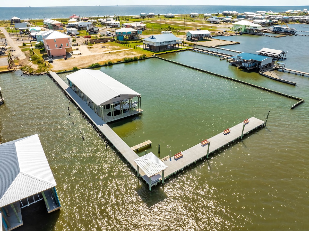 Watch the sunrise over Grand Isle Beach from your gulf front porch, then head down the private path for a day in the surf and sand. This fully remodeled 8-bedroom home gives big groups plenty of space to cook, hang out, and unwind—whether that’s upstairs in the open living areas or downstairs on the covered deck (made for seafood boils and family cookouts). Shops, bars, and restaurants are all within a short walk/drive, making this the perfect beachy getaway spot for the entire crew.