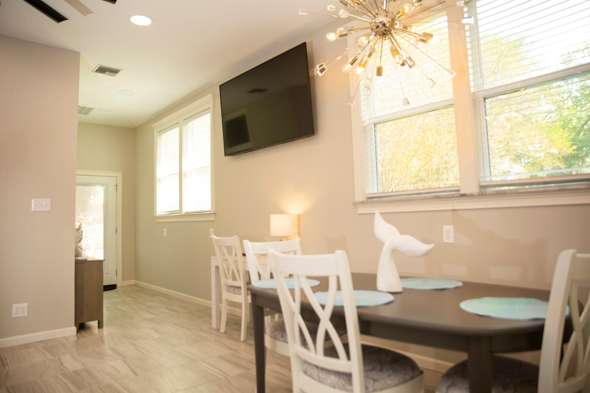 Forget your worries in this spacious and serene space. Located in a residential area, the serenity you’ll feel here, tucked away, will be like home. This is a brand new build, with all new appliances and furniture. One king sized bed in the bedroom, a pullout couch, and one queen sized air mattresses are available. This space is water front with access to a private deck and dock for fishing, or parking a boat on. Two boat ramps are located close by.