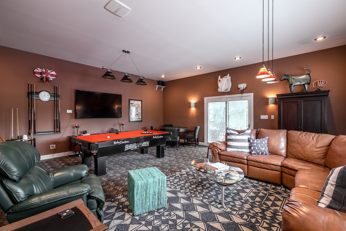 宽敞的套房、台球桌、火坑、乡村景观