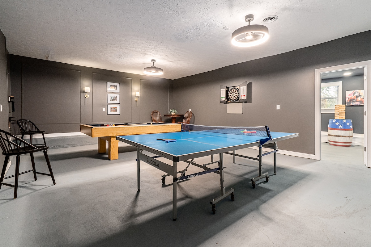 Perfect for large groups, with a MAIN HOUSE consisting of 3 bedrooms, as well as a CARRIAGE HOUSE with 2 bedrooms and an incredible GAME ROOM! Located in Beechmont, close to Churchill Downs, SDF Louisville Airport, Fair & Expo Center, University of Louisville, etc. There are smart TV’s in every room, two fully stocked kitchens, and modern bathrooms. The private courtyard between the houses includes a fire pit, a deck, and a paver patio with a gas grill, great for entertaining.