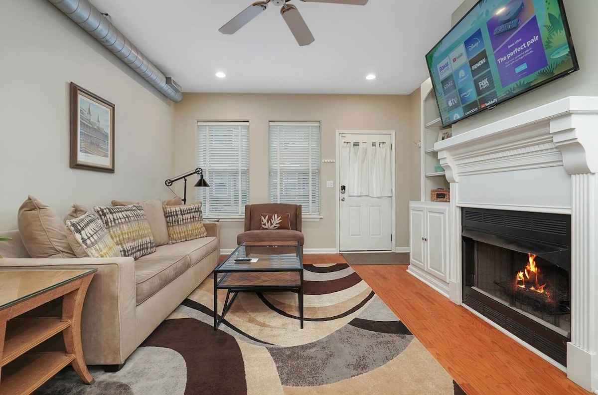 Enjoy a peaceful, cozy stay just steps from the Ohio River in Jeffersonville, only a short drive to downtown Louisville. This stylish cozy apartment features a fully stocked kitchen, a plush king memory-foam bed, and a queen memory-foam sleeper sofa for a truly restful night.Take an evening stroll across the Big Four Bridge for stunning city skyline views, or stay in for a relaxing movie night with multiple streaming options. A perfect blend of comfort, location, and charm book your stay today!