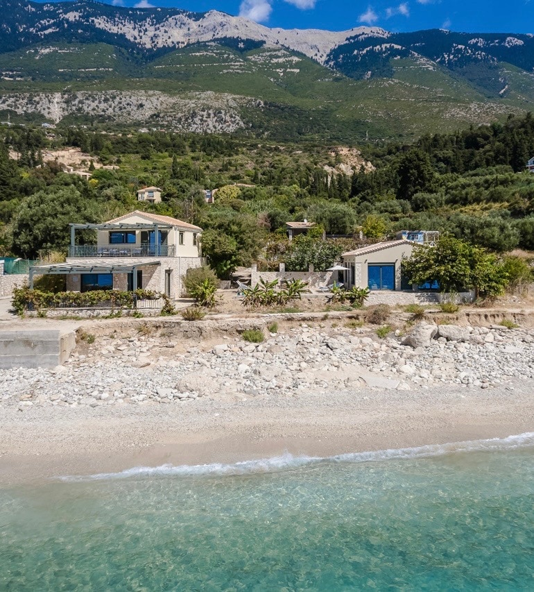 Akti Kalou is in the most-simplest terms, on the beach. With Lourdas beach as your front yard, this villa boasts 136 square meters on among the most prime real estate in all of the region of Leivathos. Experience panoramic views of the pristine waters of Lourdas Bay while feeling at home in this traditional village-meets-contemporary home. Living accommodations include 2 extremely generous master suites fully equipped with en-suites and lounging areas overlooking the beachfront. A private balcony adorns the upstairs suite and offers the perfect place to sit-back, relax and take in all the beauty Lourdas has to offer. The downstairs suite is clad in traditional stone masonry and features the uniqueness of village living. Residents of this villa enjoy two large bedrooms, on separate levels with en-suites. Both bedrooms have stunning views of the beach. Each bedroom offers a queen size bed, couches, and a desk. A day bed can be provided (at additional cost) to accommodate an addition resident in each bedroom. Full closets provide space necessary to organize wardrobes and give an at-home feeling while on holiday. The two bedrooms, as well as living room are equipped with a T.V. that are connected to local Greek channels as well as the vast variety of Hotbird and Astra satellite (open) connections. The villa is fully air-conditioned throughout. A dedicated WI-FI connection, provides reliable and fast access to the internet. The kitchen is fully equipped with a refrigerator & freezer, dishwasher, stove and microwave as well as fully stocked with dishes, glassware and cutlery. A washing machine for clothing is also located on the property.