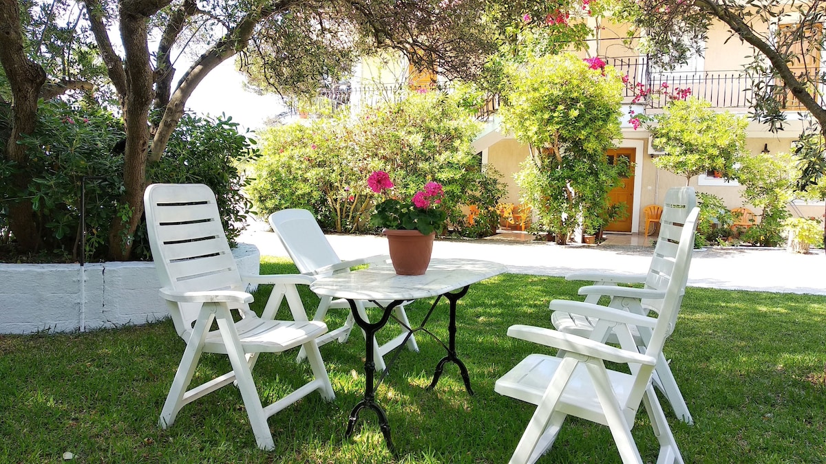 Katerina Mare at Lourdas Beach offers a unique rental experience, 5 steps away from the shore. Enjoy stunning views, soothing sounds of the waves, and unforgettable sunsets. Restaurants and a mini-market are just a minute away. Relax in the garden surrounded by lush greenery. Beach access is convenient via nearby stairs. No car is needed as the local bus connects to popular areas within walking distance.
