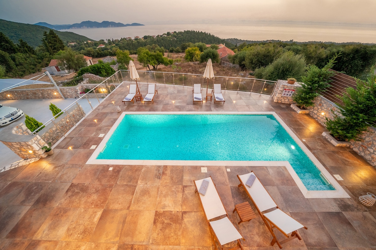 TWO BEDROOM SEA VIEW VILLA WITH PRIVATE POOL IN TRAPEZAKI Sense the ultimate feeling of luxury as you step into our two bedroom villa with private pool. Enjoy the spacious, private sundeck area, and dive into the tranquil waters of swimming pool. Agrilia Luxury Villa can accommodate up to 4 guests in its two sea view bedrooms, each with its own bathroom. Relax in the independent living room boasting majestic views of Trapezaki beach