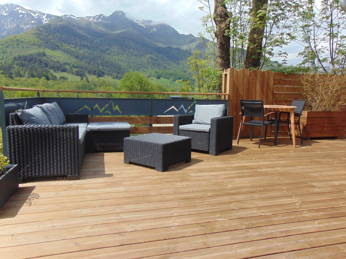 Chalet en bois, perché à 3,5 m en limite de la réserve naturelle du pibeste. Venez passer 2 nuits en amoureux ou une semaine en famille dans un cadre dépaysant et confortable. Equipé d'une petite cuisine, 2 chambres ouvertes, literie en 160, salle d'eau et toilette normale, une terrasse avec vue sur les sommets et d'un jacuzzi privatif, télévision. Le petit-déjeuner du1er et dernier jour est compris. Chalet pour 2 adultes et 1enfants, idéal en amoureux , randonneurs.