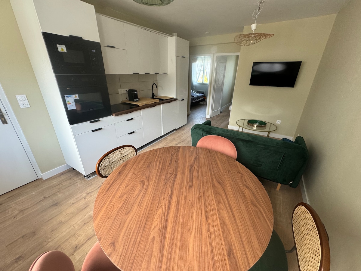 Appartement 100% cocooning, situé au deuxième étage d’une petite résidence. Emplacement calme tout en étant situé au coeur du village, avec un grand parking non privé. Un nid douillet de 35 m2 pour 4 personnes, chaleureux et raffiné. 100 m2 de terrasse et jardin privatif. Couchage: 1 chambre avec un lit en 140x190 et un grand dressing, Canapé lit avec un véritable matelas en 140x190 Lits faits à l’arrivée. Cuisine toute équipée. Salle de bain avec douche, WC indépendant. Draps de bain fournis.