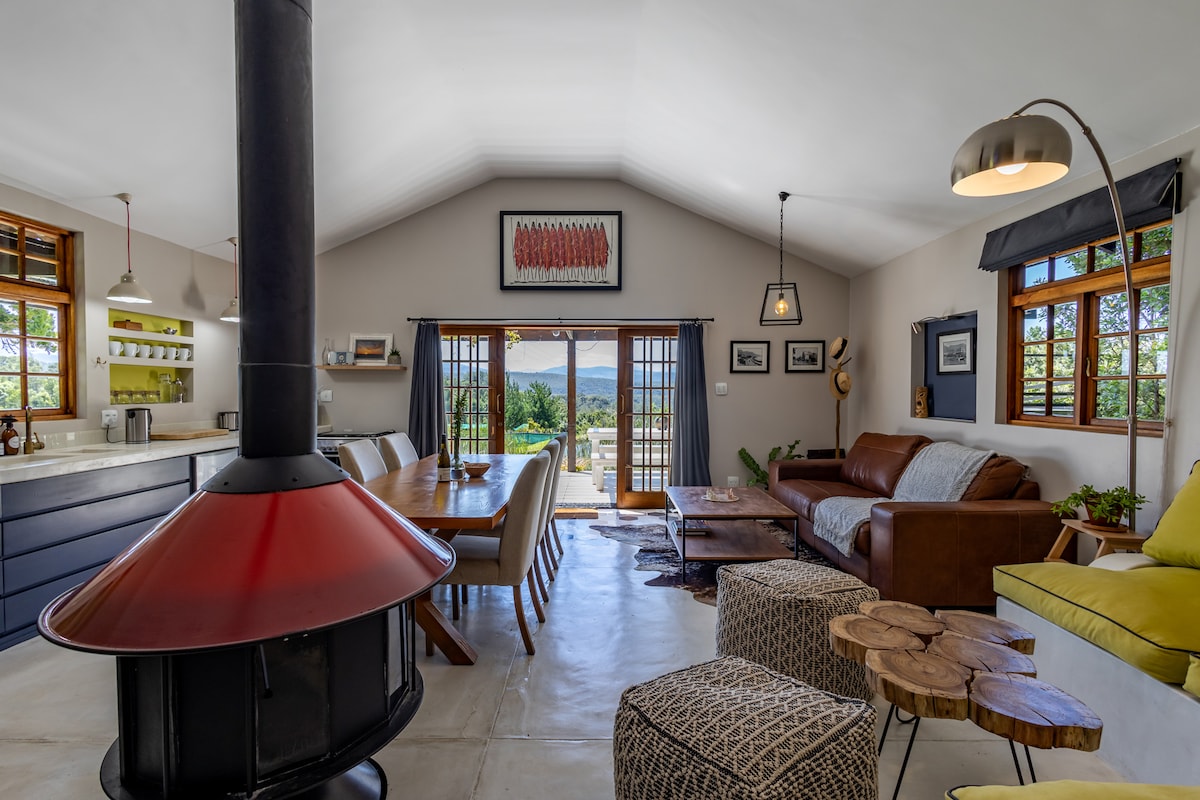 "Bird Song" is named after the host of bird calls that greet you each morning (and the night jars that you hear after dark). It is the perfect 'private bush camp' for a ‘family-of-4’ vacation or for a secluded ‘get-away-from-it-all retreat’ for couples. The architect designed timber structure is set on a slope with views through and over the fynbos and right at the edge of pristine Indigenous Forest. A wood fired fireplace ensures you are (relatively) warm in winter.