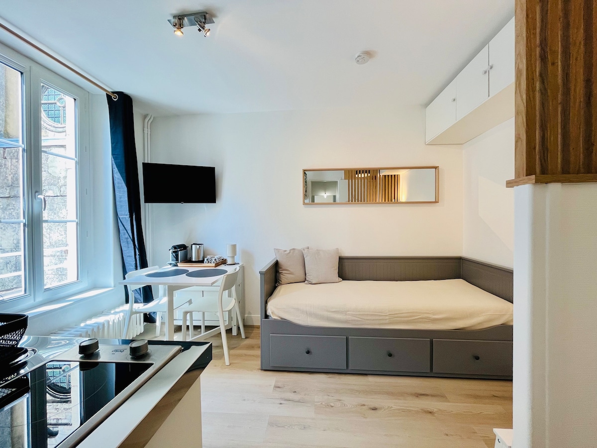 ✨Posez vos valises dans ce charmant studio rénové, situé en plein cœur du centre-ville. À la fois moderne et chaleureux, il peut accueillir jusqu'à 3 personnes, parfait pour un couple avec 1 enfant. 🛏️ Un cocon confortable Situé au 1er étage d’un petit immeuble, il offre un cadre paisible et sans vis-à-vis. La décoration soignée allie style et confort. 🔑 Un emplacement idéal Profitez d’un accès immédiat aux commerces et restaurants de la ville tout en bénéficiant d’un espace de vie agréable.