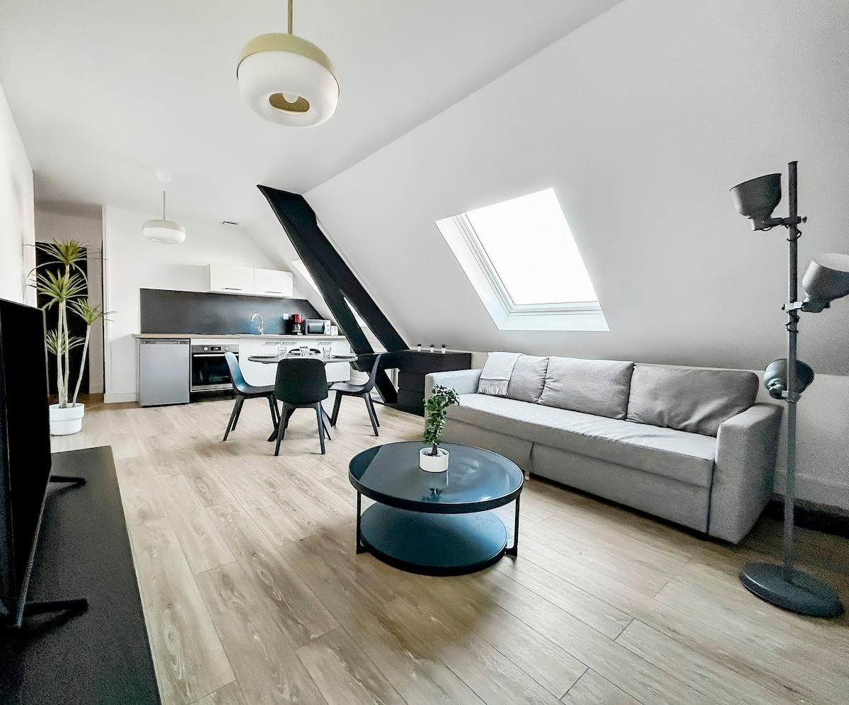 In a touristic and dynamic area, discover this exceptional modern, comfortable, bright and spacious triplex apartment which offers all the joys of visiting the city of Lens (3-4 minutes by car). Ideal location: shops and restaurants are accessible on foot at only 1 km. The Bollaert stadium is only a 15-minute walk away, ideal for going to a soccer match!