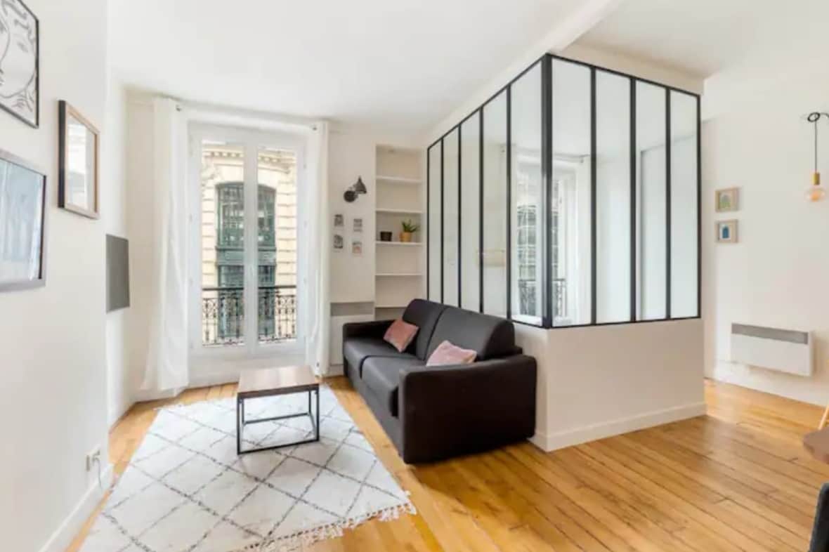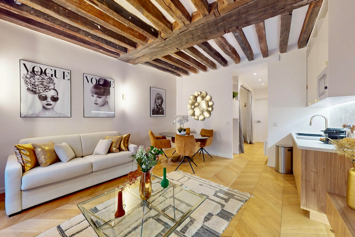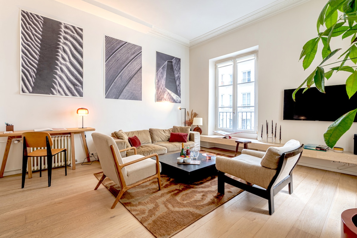 Boasting herringbone parquet flooring, fine furnishings and abundant natural light, this sophisticated 110m2 apartment offers a bright, elegant, warm and luxurious atmosphere. The apartment, with fireplace and moldings, combining charm, calm and comfort is located in one of the oldest passages in the historic center of Paris. This apartment has an official tourist accommodation operating license. So it's perfectly legal.