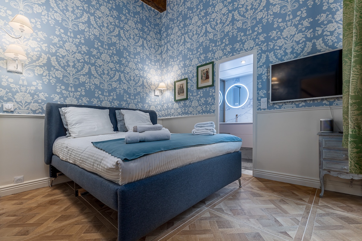 This splendid, bright and well equipped apartment ideal for 2 people is located in the very heart of Paris. You can combine the calm comfort and charm of an authentic eighteenth century "Parisian home" with antique Versailles parquet, ceiling with beams and a beautiful marble bathroom. The apartment has a fully equipped kitchen (fridge, microwave, stove and kitchenware including a kettle and Nespresso machine), a Murphy comfortable 150 bed suitable for 2, Wifi, TV and music system.