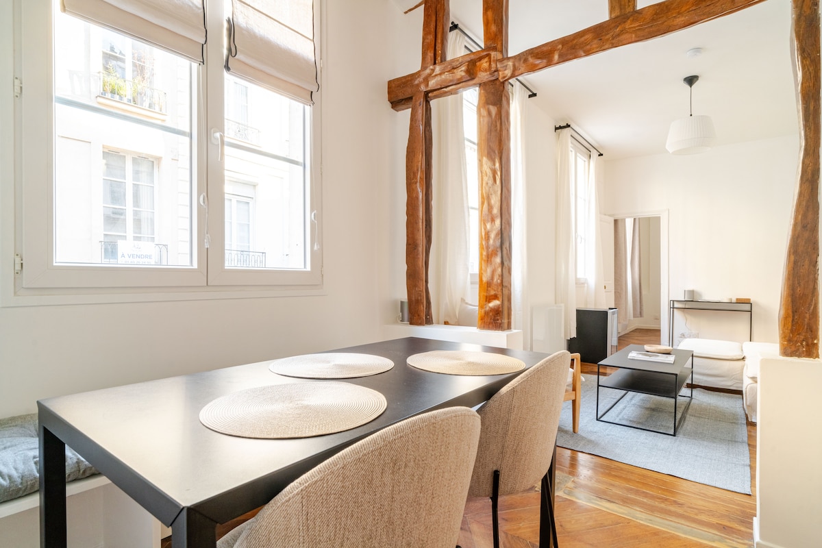 Bright 55 m² apartment, 4th floor of a “HISTORIC MONUMENT” located in the HEART OF PARIS. Open view, elevator, central air conditioning MONTORGUEUIL DISTRICT 10 min walk from Le Marais, the Pompidou Center, and Opéra 15 min from the Louvre and Palais Royal 30 min from Notre-Dame ACCESS FROM AIRPORTS/TRAIN STATIONS • Charles de Gaulle and Orly airports: 45 minutes by train, 30 minutes by taxi • Gare du Nord/Gare de l’Est: 10 minutes by direct metro METRO LINE 3 RIGHT IN FRONT OF THE BUILDING