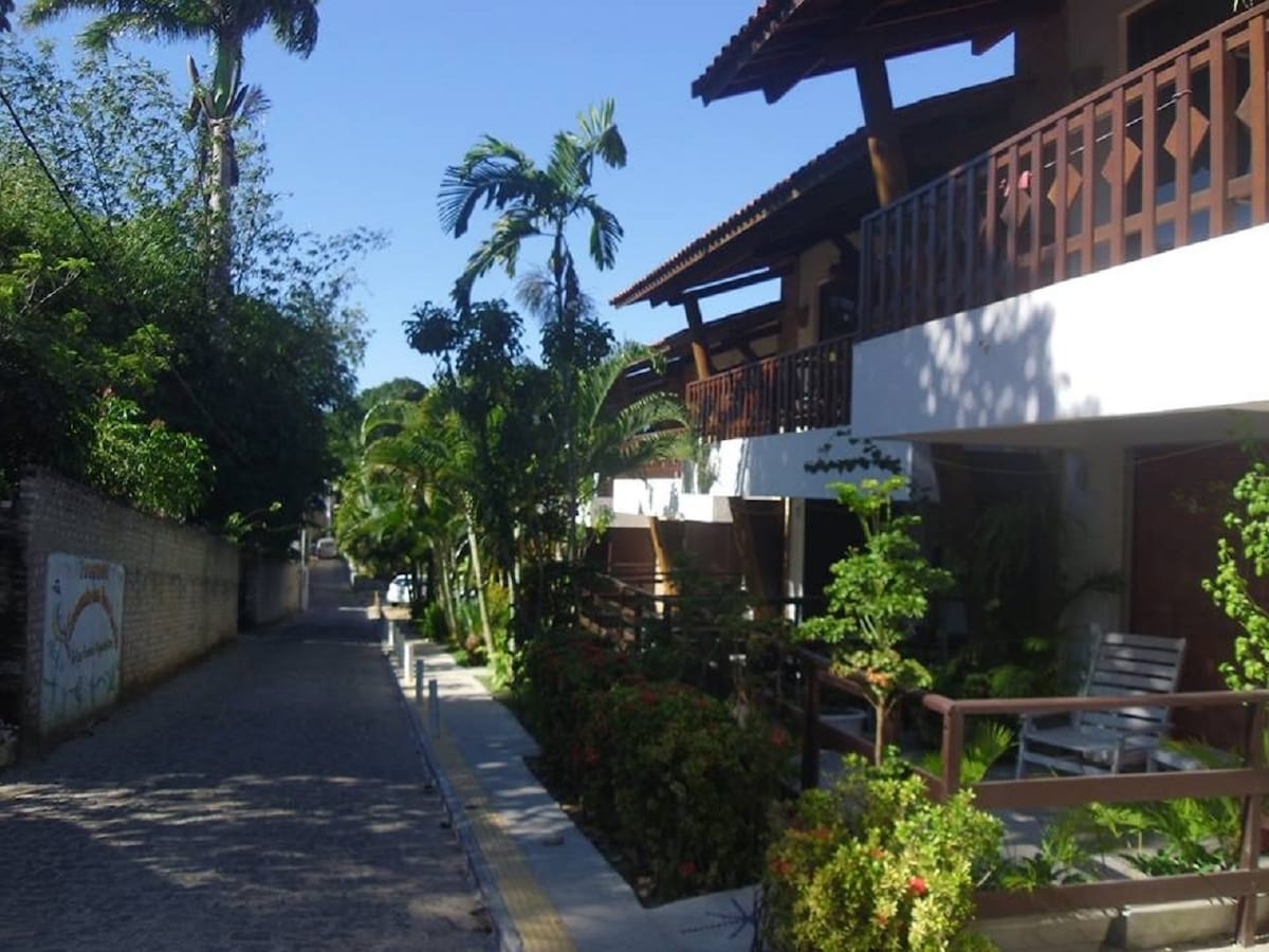 " Casa da árvore" Suíte toda em madeira especialmente para casais, localizado em área super arborizada e tranquila, suíte com cama queen, ar condicionado, frigobar, TV, banheiro com chuveiro quente e varanda. Espaço para relaxar com uma fonte no jardim. Para uso comum, espaço lazer com grande mesa, som, freezer, churrasqueira, fogão, banheiro e um chuveirão externo. Distância do centro (e praia) 1,2km, Praia do Amor 1,5km, Praia do Madeiro 3,5km.